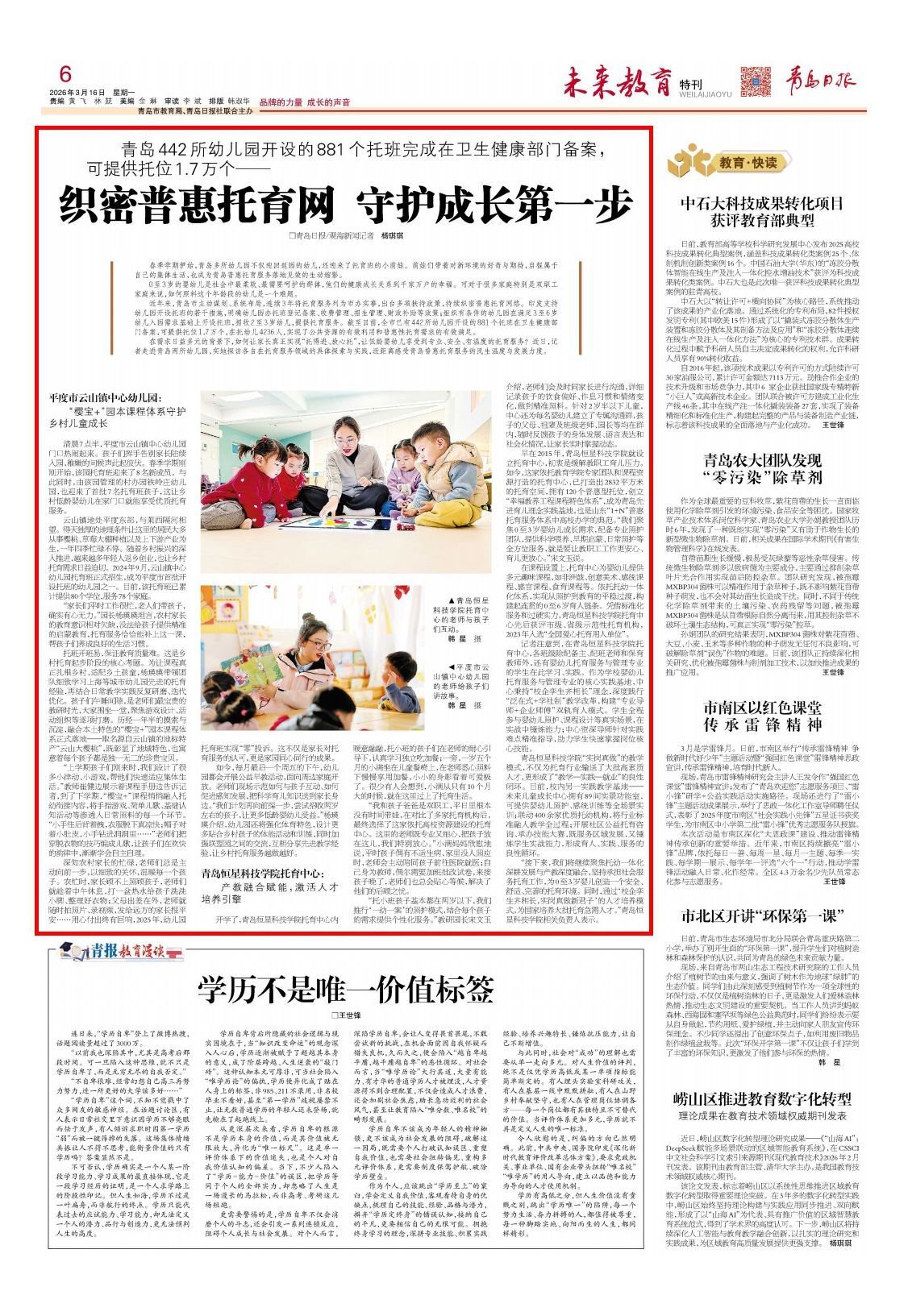 近年来,青岛市主动谋划、系统布局,连续3年将托育服务列为市办实事,出台多项扶持政策,持续织密普惠托育网络。印发支持幼儿园开设托班的若干措施,明确幼儿园办托班登记备案、收费管理、招生管理、财政补助等政策;组织有条件的幼儿园在满足3至6岁幼儿入园需求基础上开设托班,招收2至3岁幼儿,提供托育服务。截至目前,全市已有442所幼儿园开设的881个托班在卫生健康部门备案,可提供托位1.7万个,在托幼儿4236人,实现了公共资源的有效利用和普惠性托育需求的有效满足。