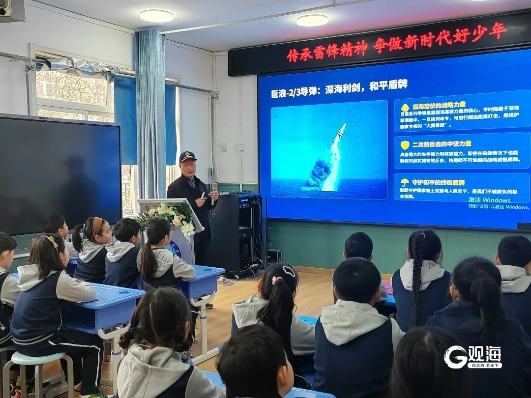 军休干部宣讲团成员董福生走进青岛市第四实验小学,以雷锋精神为指引,勉励同学们以雷锋为榜样,将奉献精神融入日常点滴,带动更多人传递温暖。为四年级学生带来《深海巨鲸——探秘海军核潜艇部队》专题宣讲,通过悬念导入、图文解析、音频播放等形式,将“水下钢铁巨兽”及潜艇兵的坚守故事生动呈现,让抽象的国防知识变得通俗易懂。
