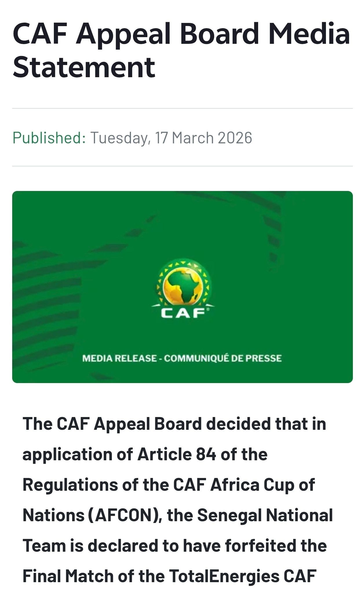 3月18日,塞内加尔足协秘书长阿卜杜拉耶·索(Abdoulaye Seydou Sow)在一档电视节目中说:“我们将联系律师并向国际体育仲裁法庭提起上诉,我们将不惜一切代价!法律站在我们这边,斗争远未结束!塞内加尔将捍卫自身权利直至最后一刻!”