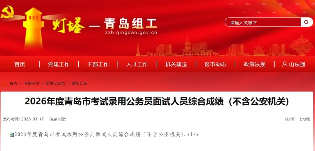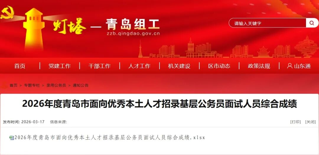 青岛市委组织部官网最新发布 2026-03-18 21:21 灯塔-青岛组工网 0 3月17日, 中共青岛市委组织部官网 “灯塔-青岛组工网”公布 《2026年度青岛市考试录用公务员 面试人员综合成绩(不含公安机关)》 《2026年度青岛市面向优秀本土人才 招录基层公务员面试人员综合成绩》。 点击图片跳转查看原文 点击图片跳转查看原文 责任编辑:孙源熙