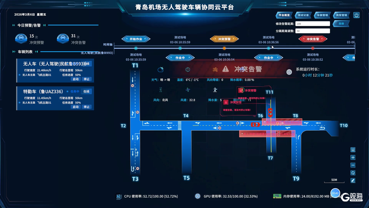本次检测覆盖33个测试科目,不仅完成了包括通过涉水路、室内外穿行、环岛行驶与避让、15%坡道的停车与起步等29项常规无人驾驶车辆的检测项目。同时在青岛机场开发的无人驾驶车辆测试管控平台支撑下,完成了无人驾驶车辆与航空器冲突的告警信号及避让管控指令下发、管控无人驾驶车辆主动避让滑行入位的航空器、避让滑出机位的航空器、避让应急救援车辆四项机场飞行区运行的专有项目检测,全面验证了无人驾驶车辆在机场环境中的性能稳定性与运行安全性,为后续飞行区实景检测奠定了坚实的技术基础。这既是对车辆性能的一次全面“体检”,也是对青岛机场无人驾驶技术体系的一次系统验证。