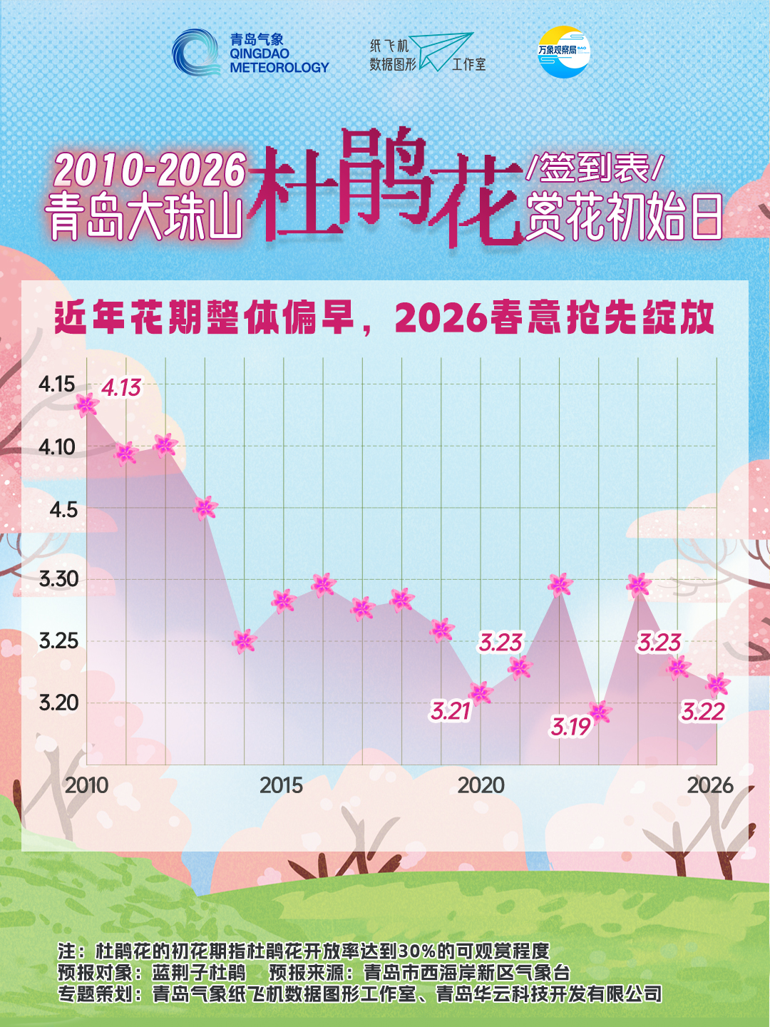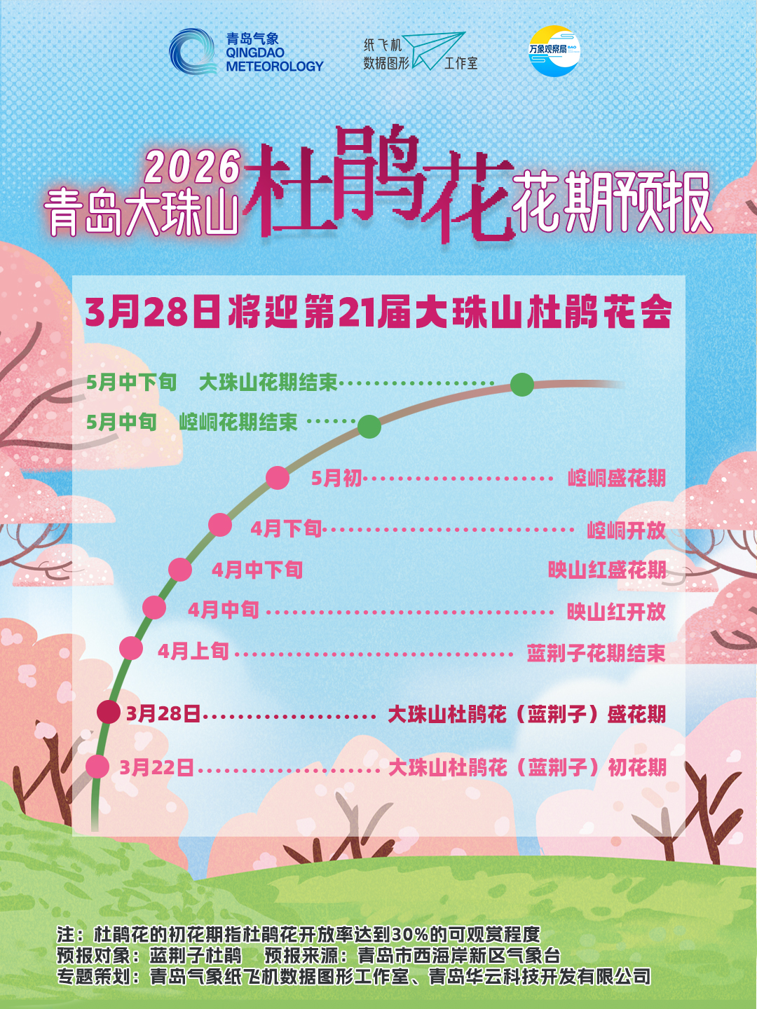 青岛日报社/观海新闻3月19日讯 春风送暖,气温渐升,青岛西海岸大珠山即将披上最艳丽的“外衣”,届时万亩野生杜鹃花从山谷到山脊将开得既热烈又自由。近日,青岛气象纸飞机数据图形工作室制作并发布了《2026青岛大珠山杜鹃花花期预报》,提醒市民不要错过这场春季限定视觉盛宴!