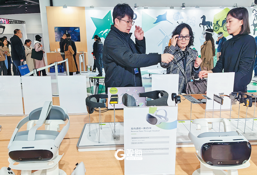 随着应用场景的增多,各类智能设备正越来越多地走进普通人的生活。图为一消费者在试戴AI眼镜。