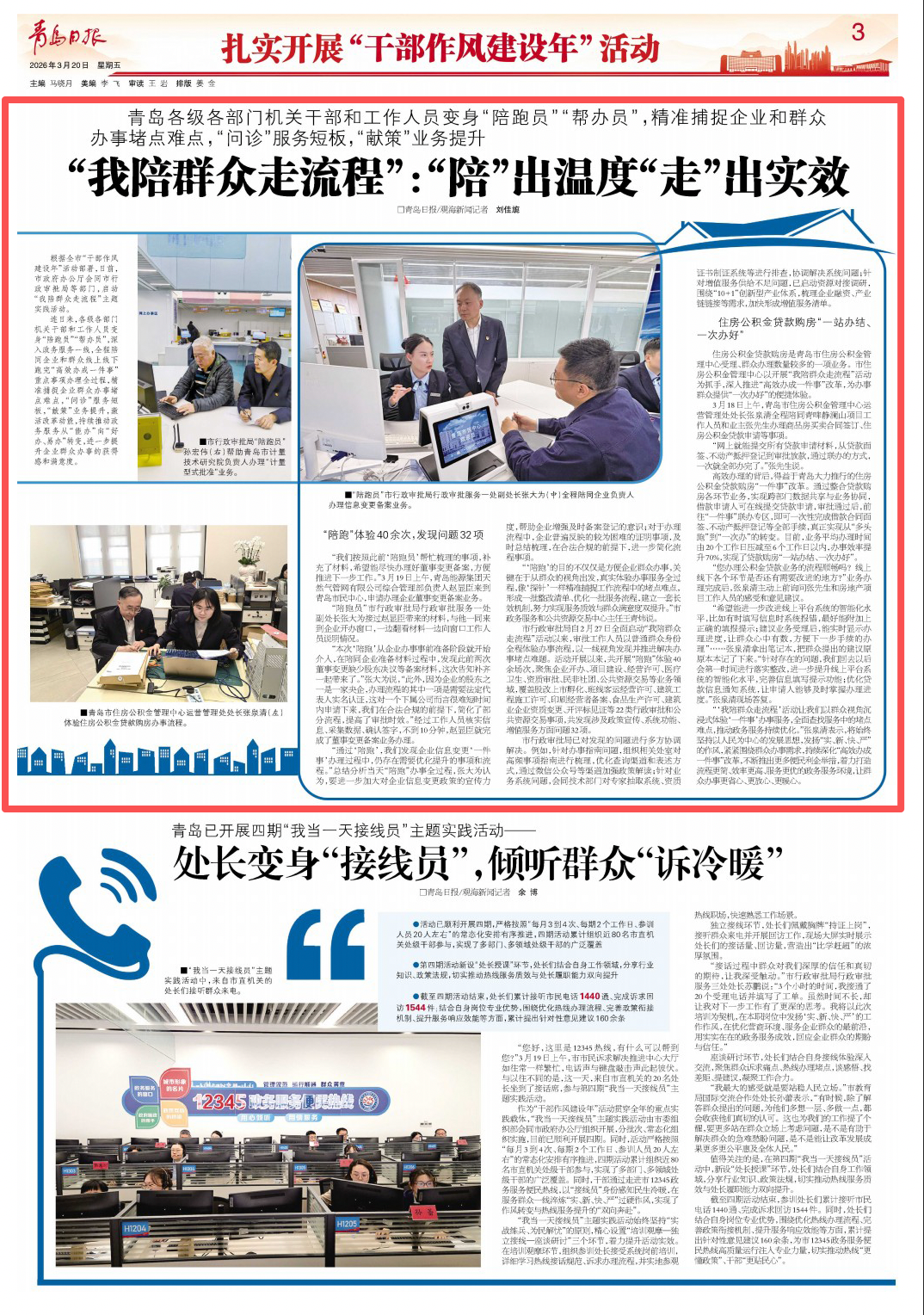 青岛各级各部门机关干部和工作人员变身“陪跑员”“帮办员”,精准捕捉企业和群众办事堵点难点,“问诊”服务短板,“献策”业务提升