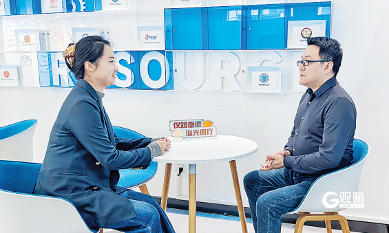 焱森垚(青岛)数字文化创意内容制作有限公司负责人郑海峰(右),在青岛檬豆网络科技公司OPIE平台寻求创业助力。 邢志峰 摄