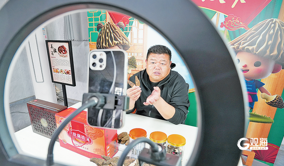 3月9日,由莱西市夏格庄镇“羊肚菌书记”葛浩顺担任法人的青岛浩鑫丰云播智慧农业科技有限公司在莱西市行政审批服务局完成注册并领取了营业执照,成为青岛首个以村党组织书记为创业主体的OPC企业。图为葛浩顺在直播带货本村的羊肚菌。