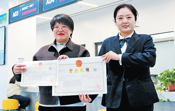 西海岸新区政务服务中心工作人员为OPC企业颁发营业执照。 王 凯 摄