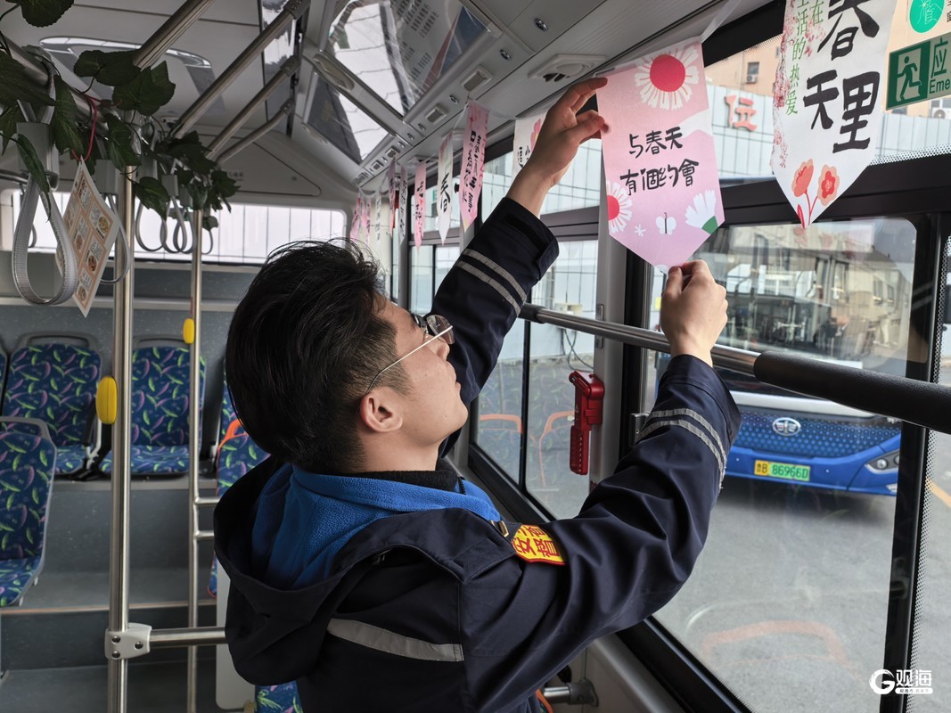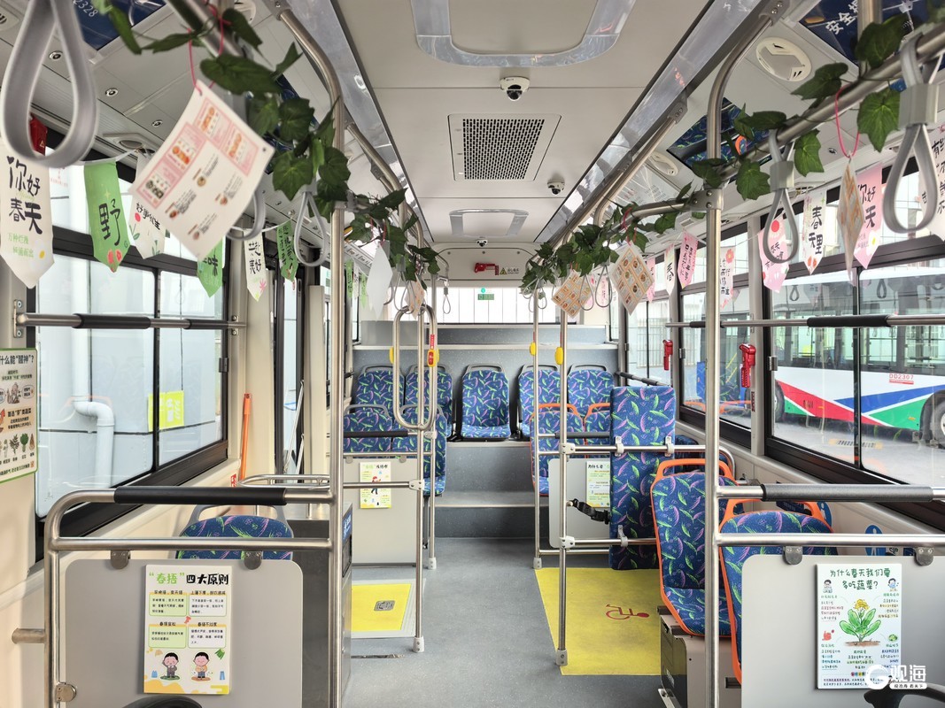 步入216路线DD2554号车主题车厢,一股清新绿色氛围扑面而来。扶手杆上缠绕仿真绿色枝叶,模拟春日草木生机,瞬间驱散乘客的疲惫感。车窗上部悬挂着印有“春日”标语的小彩旗,在微风中轻轻摇曳,营造出舒适温馨的乘车环境,让每一次出行都充满春日仪式感。