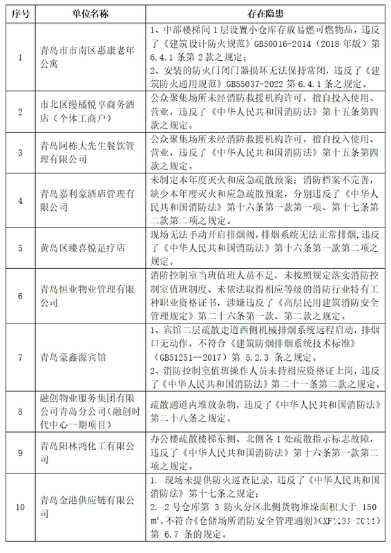青岛日报社/观海新闻3月20日讯 为切实加强春季火灾防控工作,全力维护社会面消防安全形式稳定。连日来,青岛市消防救援部门持续开展消防安全整治行动,发现10家存在消防安全隐患问题的单位场所,现对这些单位场所进行曝光。