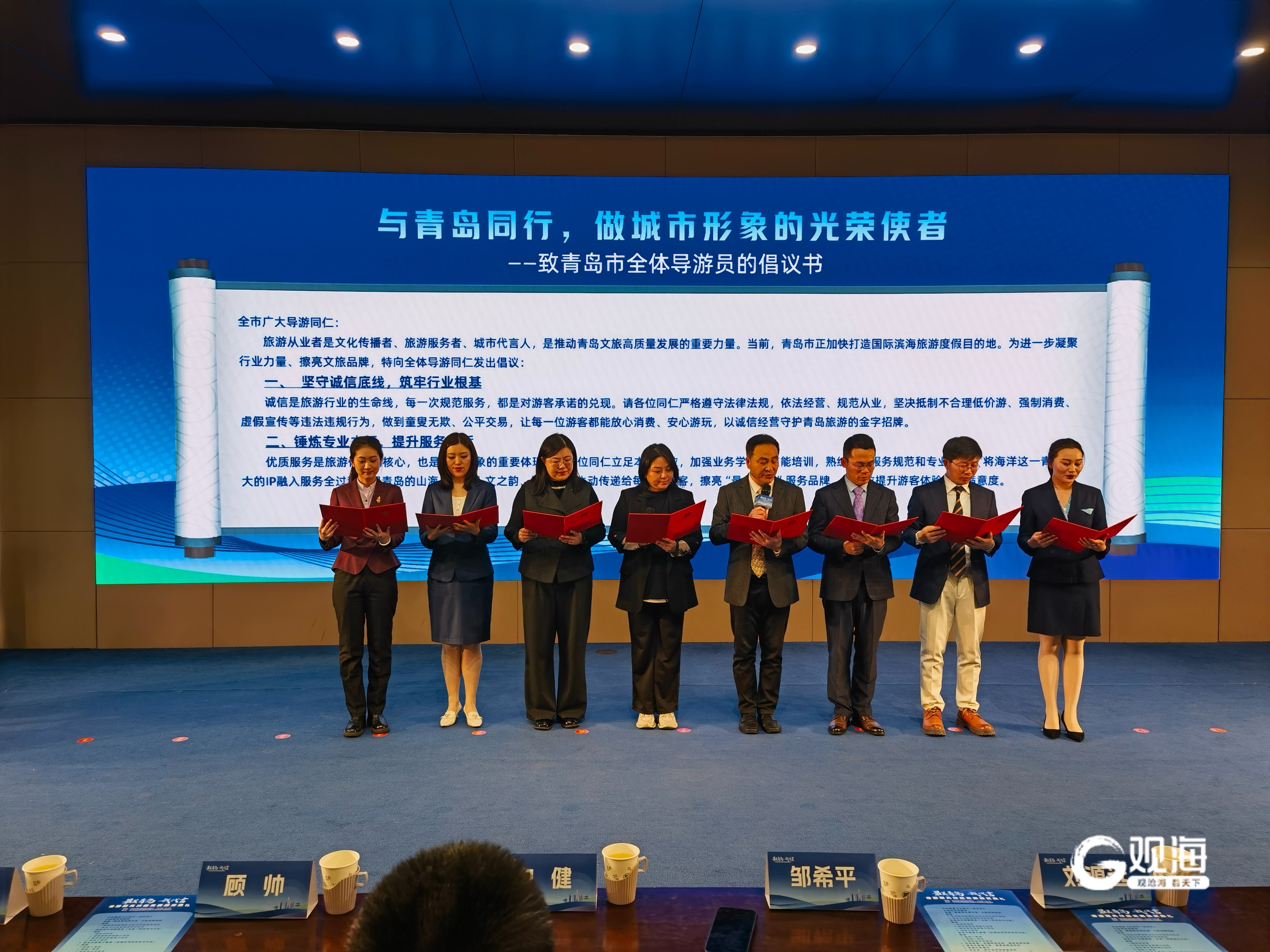 现场还举行了青岛市文旅“推介官”“观察员”聘任仪式,曲飞燕、杨科远、张展锦、刘淑利作为历届大赛优秀选手代表受聘为青岛文旅推介官,孙树伟、李莉、阎妮、段岩受聘为青岛文旅观察员。随后,推介官与观察员共同宣读《与青岛同行,做城市形象的光荣使者》行业倡议书,发出三大核心倡议:一是坚守诚信底线,筑牢行业根基;二是锤炼专业本领,提升服务品质;三是倡导文明旅游,注重温情陪伴。铿锵有力的倡议引发全场共鸣,为青岛导游行业高质量发展立下行业约定,传递服务初心。