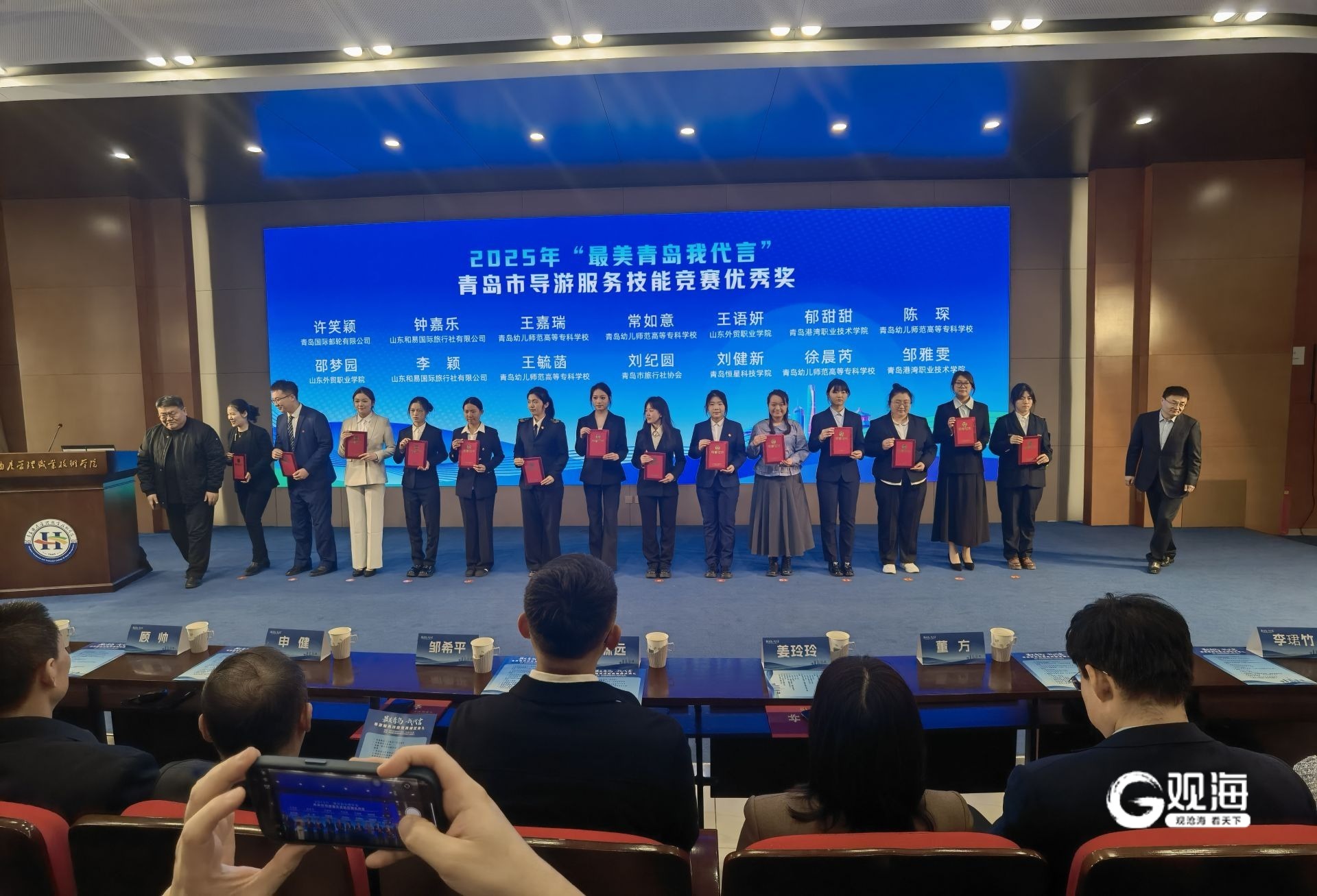 青岛日报社/观海新闻3月20日讯 3月20日,由青岛市文化和旅游局联合市委市直机关工委、市总工会、共青团青岛市委、市人力资源和社会保障局、青岛国际邮轮港区服务管理局共同指导,青岛酒店管理职业技术学院承办的“最美青岛我代言”导游服务技能大赛颁奖典礼,在青岛酒店管理职业技术学院学术报告厅举行。本次大赛以“以赛促学、以赛促练”为导向,搭建起全市导游交流展示的优质平台,为青岛文旅高质量发展凝聚人才力量。
