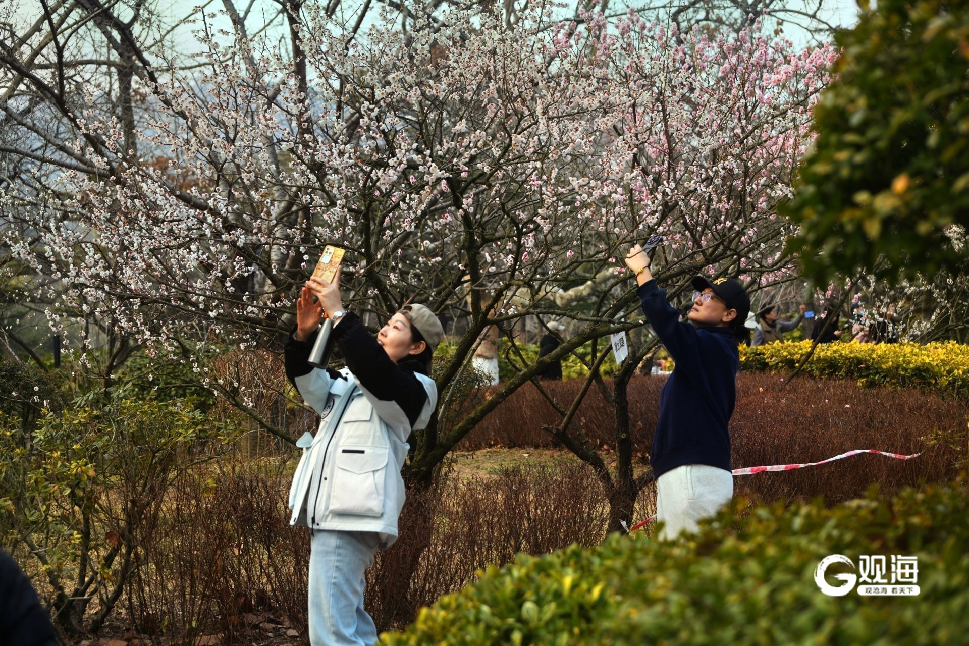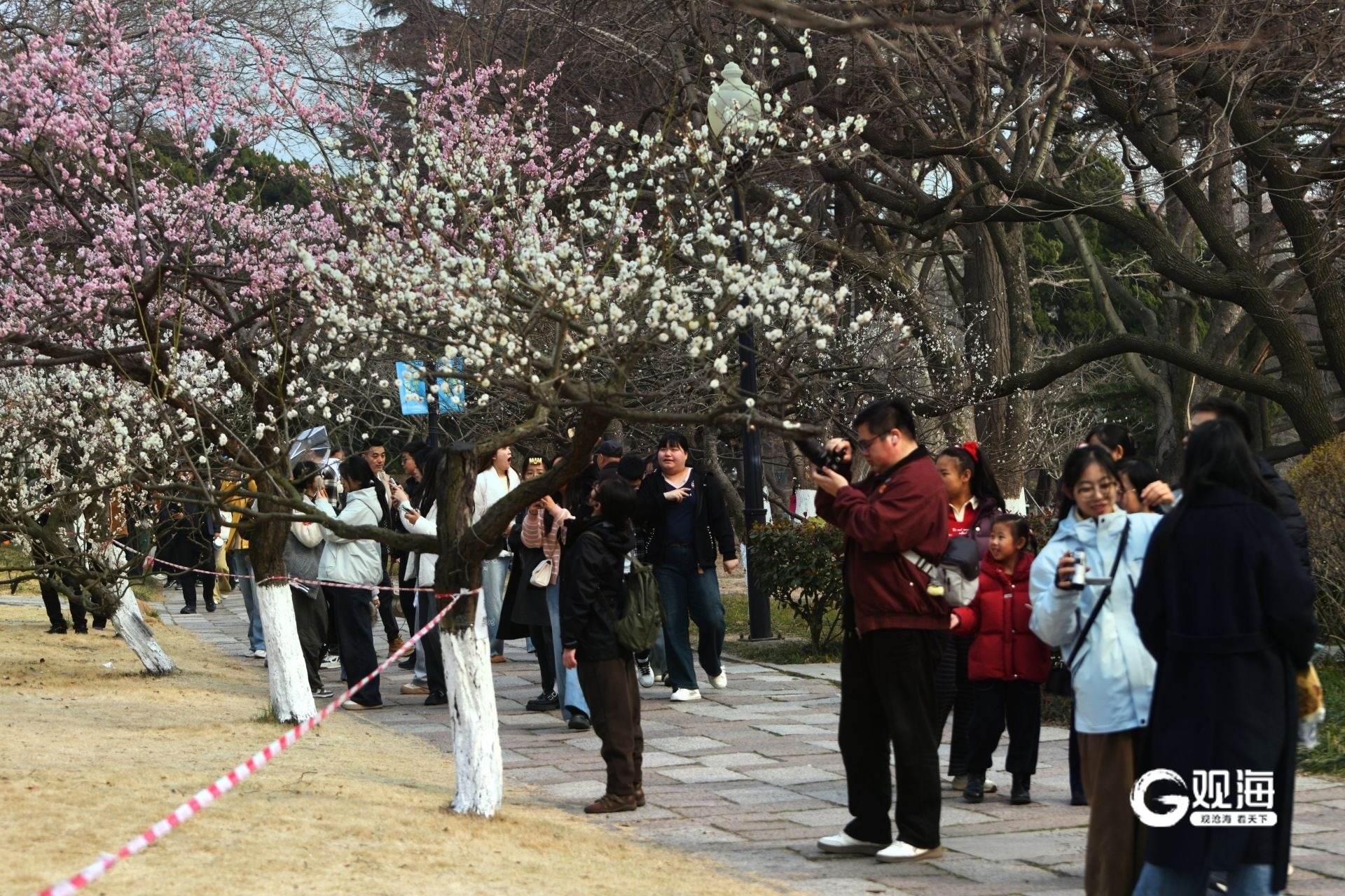 青岛日报社/观海新闻3月22日讯 22日下午,春和景明,在中山公园,梅花正值盛花期,宫粉、朱砂、玉碟等多个品种的梅花竞相绽放,将公园装点成一片绚烂的花海。市民们三五成群,或漫步于花径之下,或驻足于花树之前,用手机记录下这美好的春日瞬间。