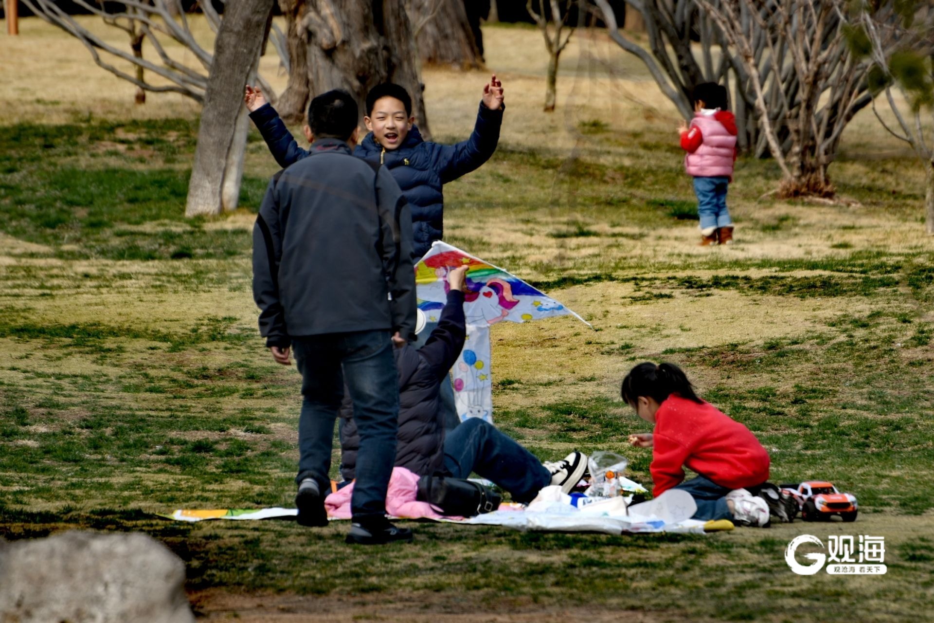 不远处的百花苑同样是一派热闹景象。这里草木返青,吸引了大量市民前来踏青。开阔的草坪上,孩子们追逐嬉戏,风筝在蓝天上翱翔;家人们在树荫下铺开野餐垫,享受着惬意的午后时光。享受着春日带来的无限生机与美好。