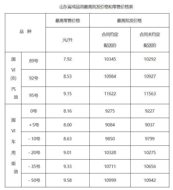3月23日,山东省发展改革委发布公告,3月23日24时起,山东成品油价格调整。公告显示山东成品油的最高零售价格为:92号汽油每升8.53元,95号汽油每升9.15元,0号柴油每升8.16元。