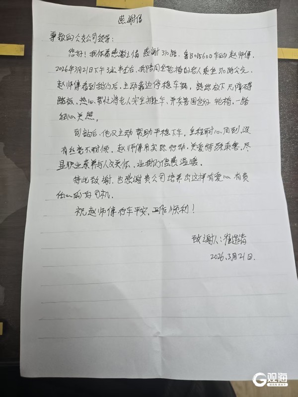 “非常感谢赵师傅,祝他行车平安,工作顺利。”3月23日,青岛城运控股公交集团市北巴士第三分公司收到市民崔先生的一封感谢信。原来,崔先生带着坐轮椅的老人乘车时,得到了310路驾驶员的热情帮助,令他十分感动。