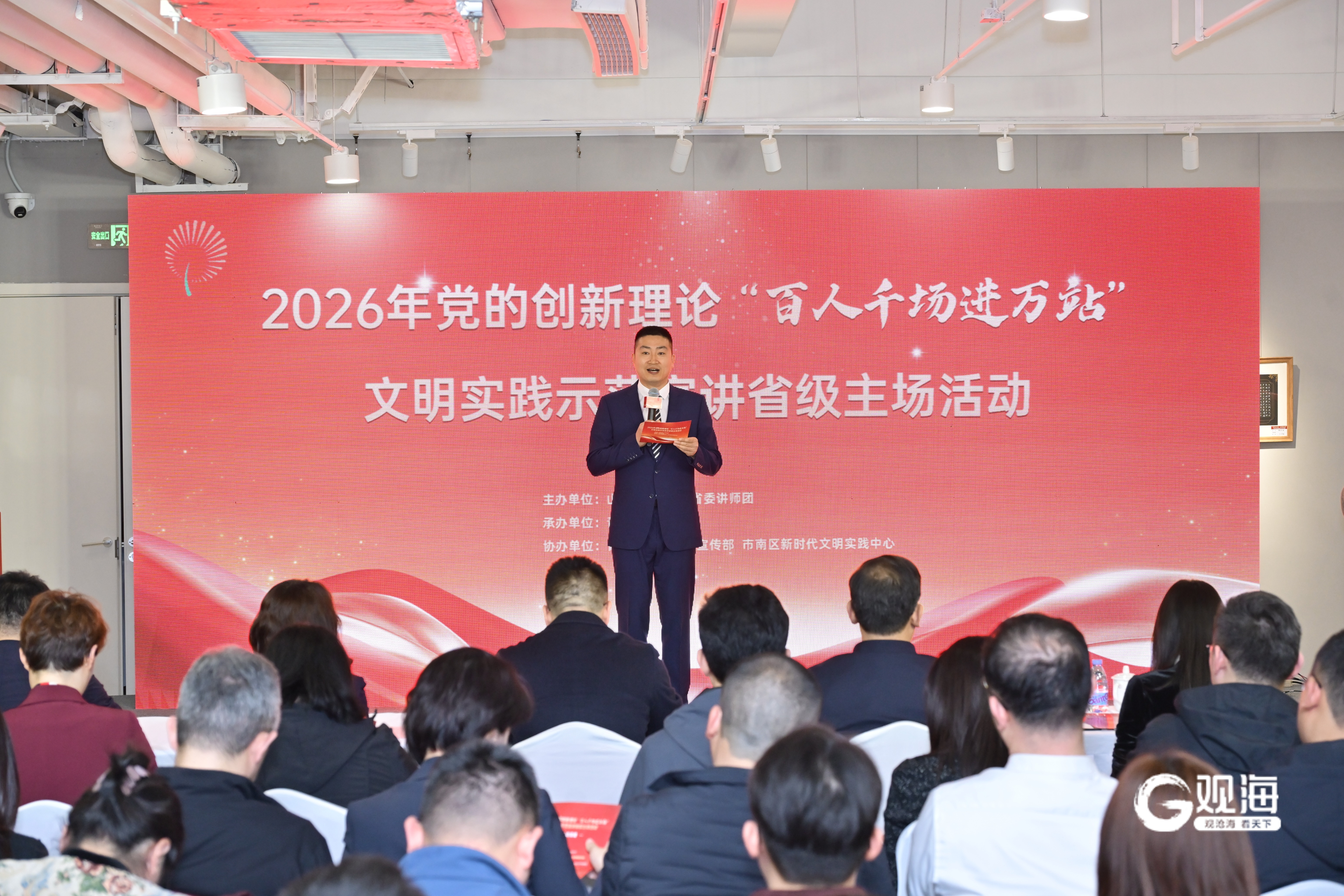青岛日报社/观海新闻3月24日讯 24日下午,2026年党的创新理论“百人千场进万站”文明实践示范宣讲省级主场活动在青岛市市南区海岸书院举行。活动由省文明办、省委讲师团主办,青岛市委宣传部承办,以丰富的宣讲形式和暖心的服务供给,使理论传播内化于心,让民生关切外化于行,让党的创新理论在海风书香中“锦上生花”、浸润民心。