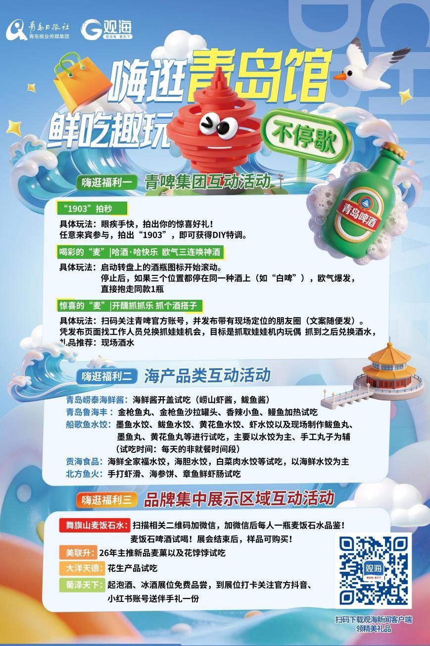 值得一提的是,青岛馆不仅有好物可看、可品,更有丰富的互动活动等待解锁。据了解,展会期间,青啤集团将在每天上午和下午各设一个半小时的互动时间,“1903”拍秒、哈酒·哈快乐、欧气三连唤神酒、开醺抓抓乐、抓个酒搭子等,参与互动将有机会获得免费酒水。“海味青岛”板块的崂泰海鲜酱、鲁海丰、船歌鱼水饺、贡海食品、北方鱼火等品牌,将带来海鲜水饺、手工丸子、金枪鱼制品、虾滑等现场试吃,让市民游客沉浸式体验地道海味与本土品牌魅力。