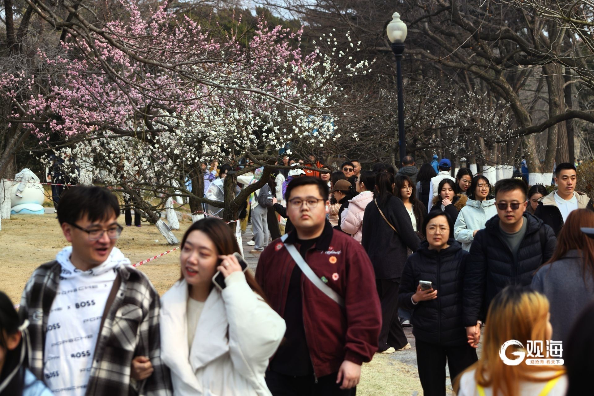 22日下午,春和景明,在中山公园,梅花正值盛花期,宫粉、朱砂、玉碟等多个品种的梅花竞相绽放,将公园装点成一片绚烂的花海。市民们三五成群,或漫步于花径之下,或驻足于花树之前,用手机记录下这美好的春日瞬间。