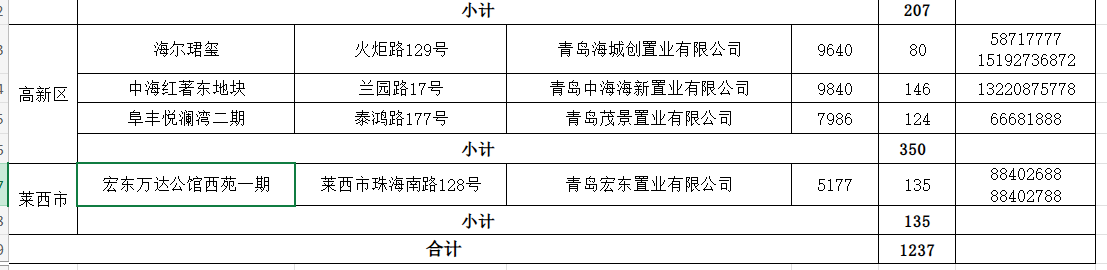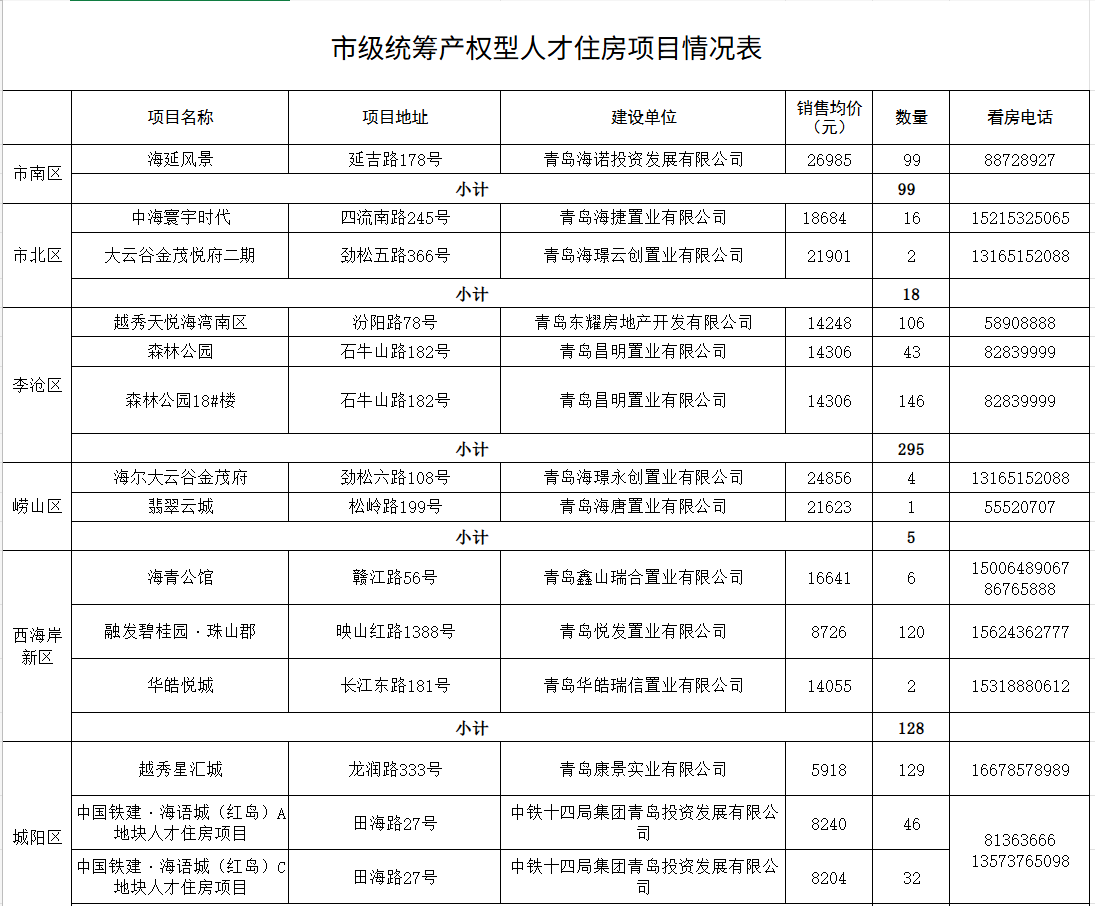记者注意到,情况表中包括市南区1个项目、市北区2个项目、李沧区3个项目、崂山区2个项目、西海岸新区3个项目、城阳区3个项目、高新区3个项目、莱西市1个项目。名单中既有这些在售产权型人才住房项目的名称、具体地址,还包含建设单位、销售均价、数量以及看房电话。(青岛日报/观海新闻记者 王冰洁)