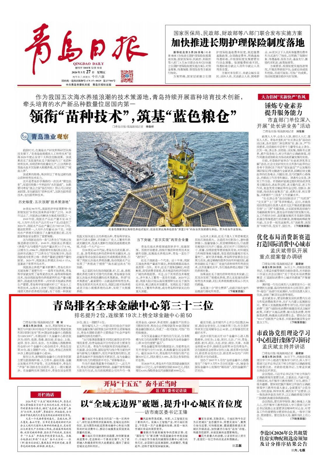 青岛日报社/观海新闻讯 26日,英国智库Z/Yen集团与中国(深圳)综合开发研究院在英国伦敦和深圳同时发布“第39期全球金融中心指数报告(GFCI39)”,本期全球十大金融中心排名依次为:纽约、伦敦、香港、新加坡、旧金山、上海、迪拜、首尔、深圳、东京。在本期纳入指数榜单的全球137个金融中心综合排名中,青岛位居第33位,较上期提升2位。至此,青岛已连续第19次上榜全球金融中心前50。