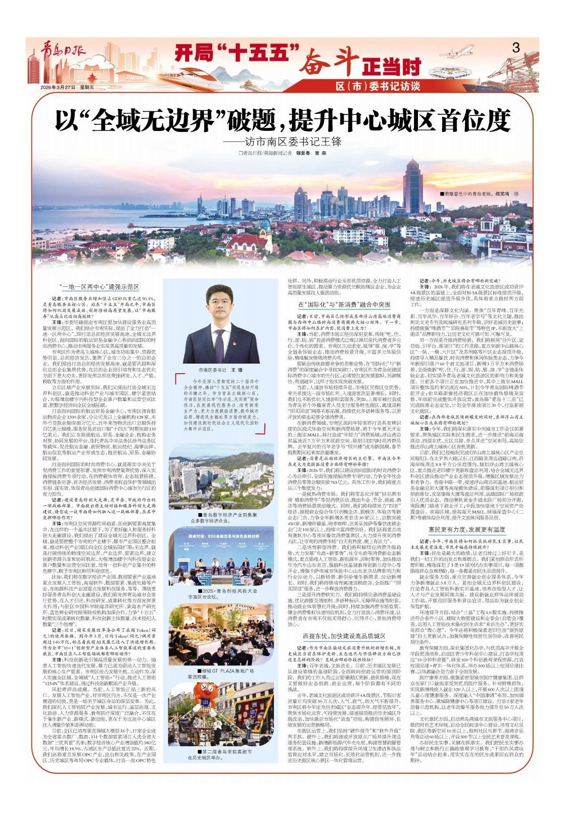 今年是深入贯彻党的二十届四中全会精神、推动“十五五”实现良好开局的关键之年。作为青岛主城核心区,市南区坚定扛牢“作示范、见实效”使命担当,在发展现代服务业、培育新质生产力、更大力度提振消费、提升城市品质、增进民生福祉等方面持续发力,加快建设新时代社会主义现代化国际大都市示范区。