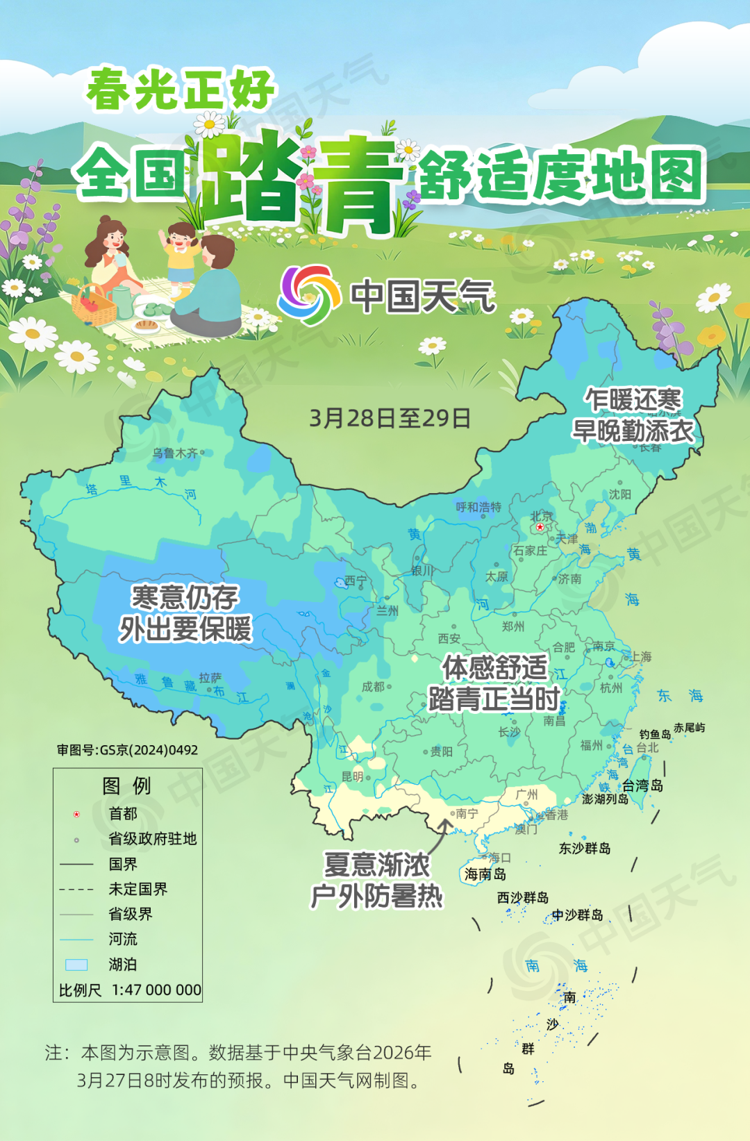 从中国天气网推出的全国踏青舒适度地图来看,本周末,我国中东部大部体感舒适,适宜踏青出游;内蒙古大部、黑龙江、吉林、山西大部、宁夏等地春寒料峭,白天暖意冒头,早晚天气寒凉,户外踏青需添衣;青藏高原多地寒意仍存,寻春尚需时日。