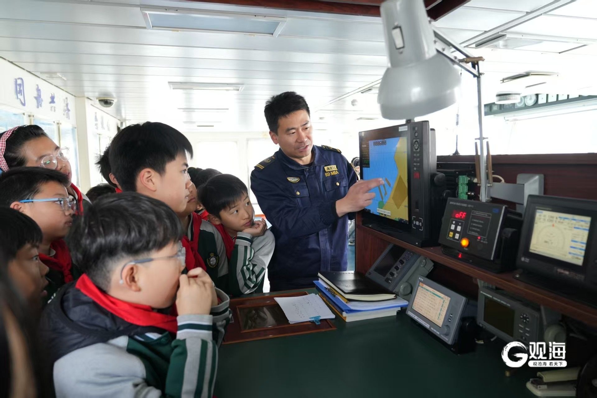 随后,在“探秘海巡11”环节,同学们分组走进船舶驾驶台。雷达屏幕上的光点、罗经的精准指向、先进的通讯设备……一切对于孩子们而言都充满了新奇与神秘。在工作人员的指导下,同学们轮流体验了“小小船长”的角色,手握舵轮,眺望远方,眼神中充满了对海洋的向往与敬畏。