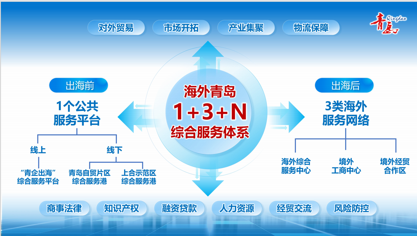 目前,青岛已率先启动 “海外青岛” 综合服务体系建设,推进“1+3+N” 综合服务体系落地实践,即搭建1个线上+线下“海外青岛”综合服务公共平台、规划3个海外服务网络、协同推动N项专业精准服务。此次发布的 “海外青岛20条”,以 “1+3+N” 综合服务体系为核心框架,创新构建 “19项重点任务+ 1项工作保障机制” 的全链条闭环体系,精准补齐企业出海全流程服务短板,让青岛企业出海有方向、发展有支撑、经营有保障、拓界有底气。