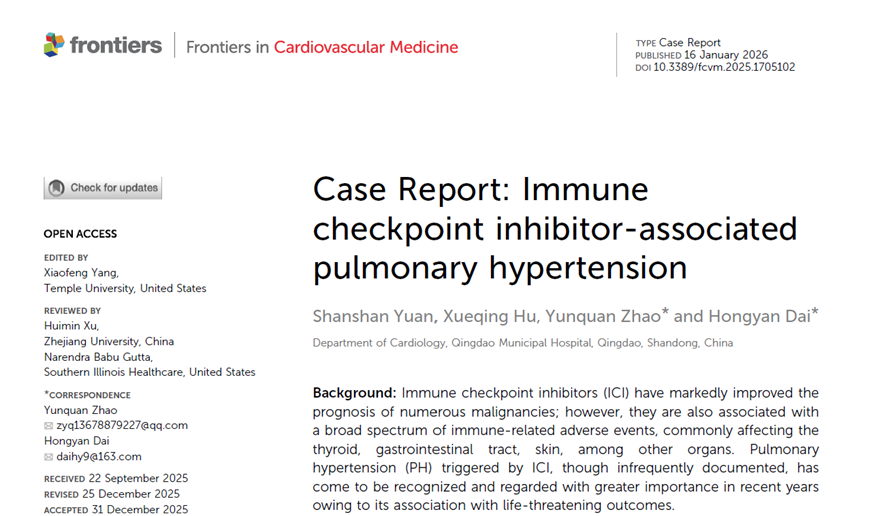 青岛日报社/观海新闻3月30日讯 肺动脉高压是一种严重的循环系统疾病,其中动脉型肺动脉高压是病情最严重、预后最差的一种类型,也被称之为“心血管系统的癌症”。这类疾病病因繁多,其中药物相关肺动脉高压是重要的病因之一。近日,青岛市市立医院保健三科主任戴红艳带领肺动脉高压团队成功诊断并救治一例由抗肿瘤药物免疫检查点抑制剂(PD-1抑制剂)引发的重度肺动脉高压患者,为肿瘤免疫治疗相关罕见不良反应的识别与处理提供了宝贵的临床经验,为肿瘤患者的安全治疗敲响了警钟。