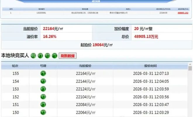 青岛日报社/观海新闻3月31日讯 3月31日,备受青岛楼市瞩目的崂山区同安路以东、辽阳东路以南LS0203061低密宅地成功出让。4家开发商历经155轮竞价,最终由青岛兴茂置业有限公司(金茂置业)以总价4.89亿元、成交楼面地价22164元/㎡成功摘得这宗崂山核心区近五年密度最低的优质宅地,溢价率16.26%。