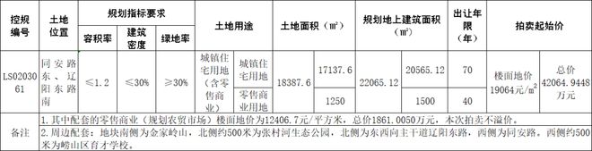 公告显示,该地块控规编号为LS0203061,土地总面积18387.6㎡(以实测为准),其中城镇住宅用地17137.6㎡、零售商业用地1250㎡;规划地上总建筑面积22065.12㎡,含住宅 20565.12㎡、零售商业1500㎡(规划农贸市场)。地块规划指标明确:容积率≤1.2,建筑密度≤30%,绿地率≥30%,住宅套数≤184 套;建筑高度控制在27米以内,同时需满足日照、机场净空、风貌及相关规范要求;城镇住宅用地出让年限70年,零售商业用地40年。