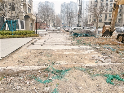 记者在现场探访看到,大港纬四路位于保利悦公馆西区、东区之间,被大港二路分隔成南北两段,北段路面平整,而南段路面坑洼不平、杂草丛生,铺设的密目网已破碎,路面堆放着建筑垃圾,还停放着一台挖掘机和多辆机动车。