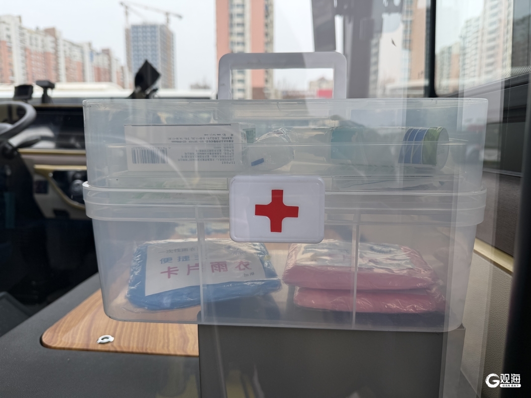 走进车厢,一个醒目的便民服务箱格外引人注目。打开箱子,里面整齐摆放着一次性雨衣、防滑鞋套——这是为应对山中突发天气而准备的贴心物件;藿香正气水、消毒棉片、晕车药等基础医药品一应俱全,以备乘客不时之需。这些物资由专线驾驶员定期检查、及时补充,确保每一件物品都处于可用状态。一个小小的服务箱,承载的是公交人对乘客安全与健康的无声守护。