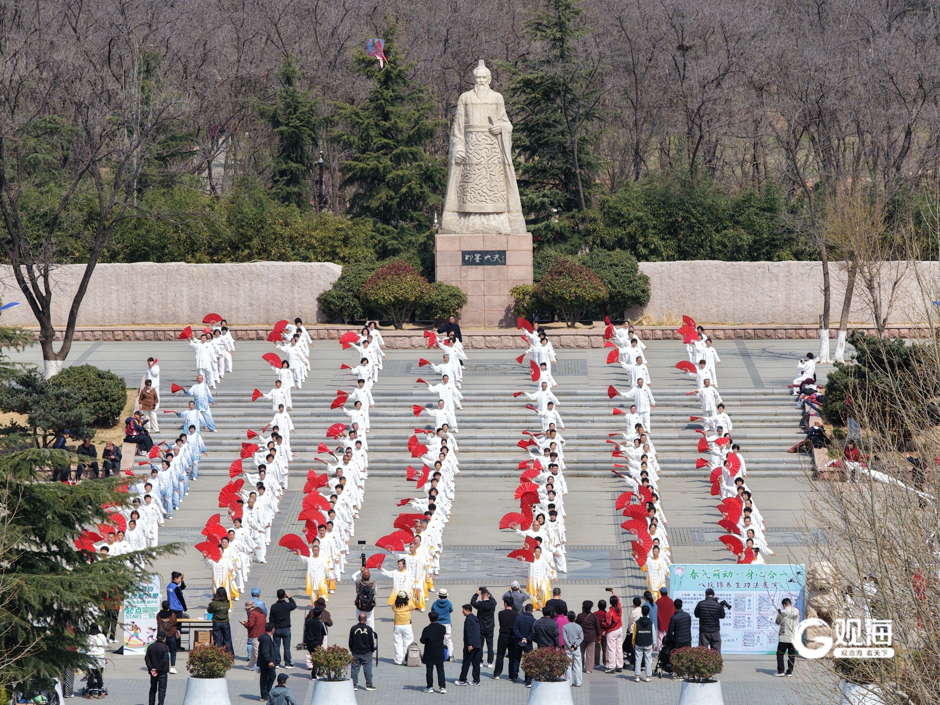 即墨大夫广场上,百余名群众身着统一服饰,在悠扬古乐声中展演八段锦。队伍动作整齐划一,行云流水,展现出市民群众健康向上、充满活力的精神风貌,以实际行动倡树健康生活方式。