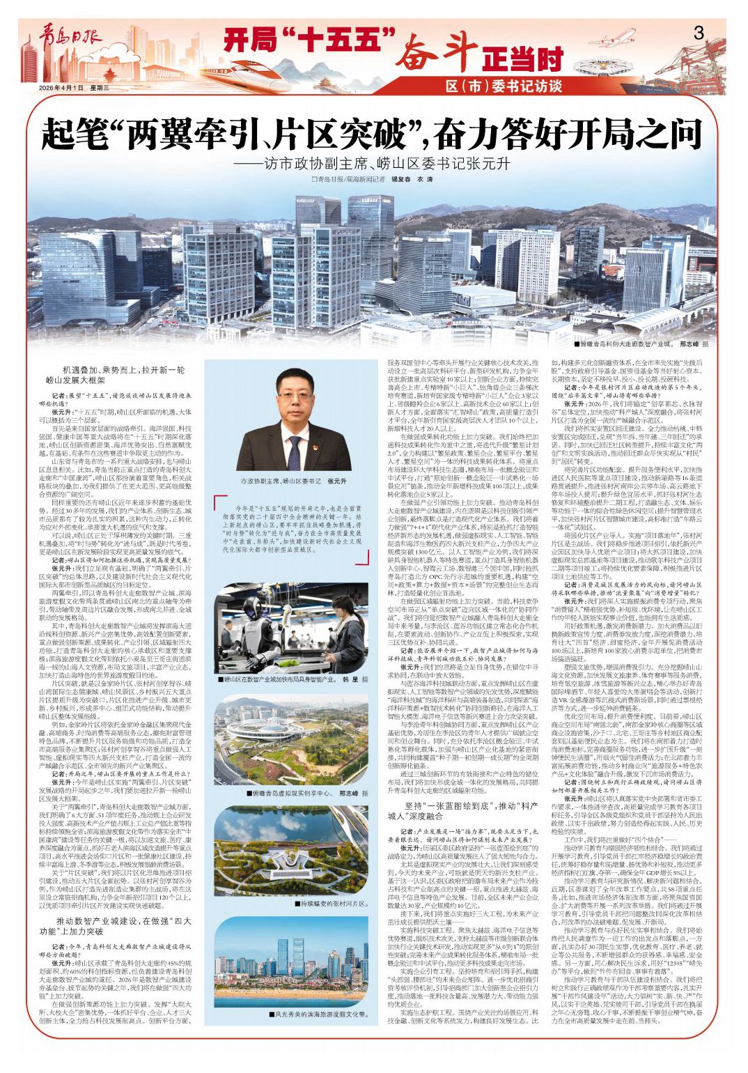 关于“两翼牵引”,青岛科创大走廊数智产业城方面,我们明确了6大方面、51项年度任务,推动规上企业研发投入强度、高新技术产业产值占规上工业总产值比重等指标持续领跑全省;滨海旅游度假文化带作为落实全市“中国康湾”建设等任务的关键一极,将以加速文旅、医疗、康养深度融合为重点,抓好石老人滨海区域改造提升等重点项目,高水平推进会场仰口片区和一批健康社区建设,持续丰富海上游、冬季游等业态,积极发展银龄消费场景。