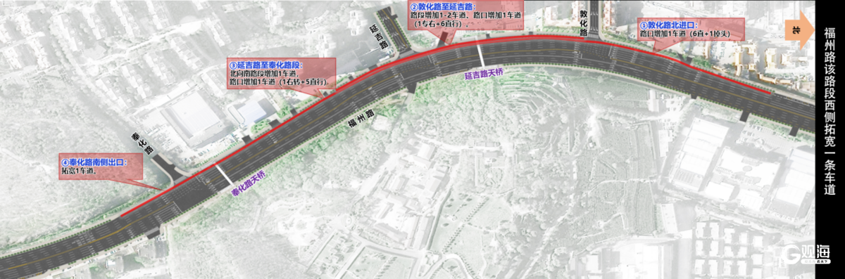 为此,公安交管部门会同住建等部门统筹规划、精准施策,通过道路拓宽改造、增设人行过街设施、打造出市快速通道等举措,扩大入市方向车辆蓄车空间,高效疏导出市方向车流,全力破解路段通行难题。一是拓宽道路空间,提升承载能力。对福州路(奉化路至敦化路段)实施物理拓宽,增设进口车道,优化公交港湾布局,以提升车道通行效率与路段蓄车容量,增强整体通行承载力。二是打造快速通道,疏导出市车流。在该路段南向北方向设置物理隔离设施,保障外侧三条车道连续快速通行,重点强化晚高峰出市车流疏导,减少车流交织,保障主线顺畅。三是建设过街设施,实现人车分离。在福州路奉化路以北、延吉路以北两处节点新建人行过街天桥,并配套无障碍电梯,兼顾周边多个路口行人过街需求,消除人车混行安全隐患,为车辆快速通行创造条件。四是精细路口组织,破解通行瓶颈。对福州路(江西路至敦化路段)沿线各路口进行精细化交通优化,通过绿化带改造、左转车道外置等方式,优化路口车道功能与时空资源,提前化解拥堵节点,整体提升区域路网通行效率。