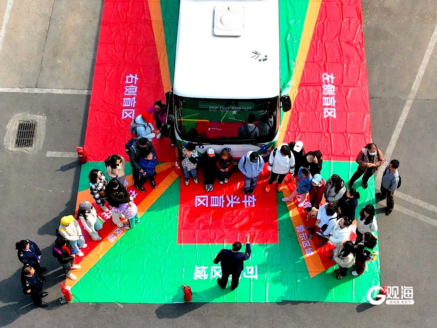活动伊始,市南巴士三分公司安全员殷治华将一张特殊的“地垫”铺在公交车前。这是市南巴士自主设计制作的1:1车辆盲区示意地垫,完全按照公交车实际比例绘制,用醒目的颜色区分不同区域:绿色代表驾驶员可直接观察到的可视区域,红色则标识出车头、A柱、车身两侧等关键盲区。