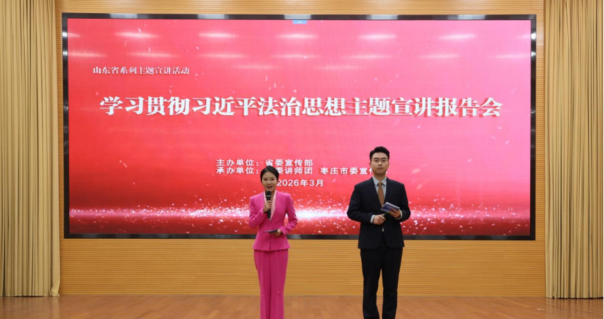 3月31日上午,由省委宣传部主办,省委讲师团、枣庄市委宣传部承办的山东省学习贯彻习近平法治思想主题宣讲报告会在枣庄市市政大厦二楼报告厅举行。本次宣讲报告会聚焦学习贯彻习近平法治思想主题,结合新时代法治山东建设实际,采取“理论宣讲+故事宣讲+小戏小剧+TED演讲”形式,精准对接基层法治需求、贴近干部群众实际,呈现了一场内容丰富、贴近实际、感染力强的法治宣讲报告会。