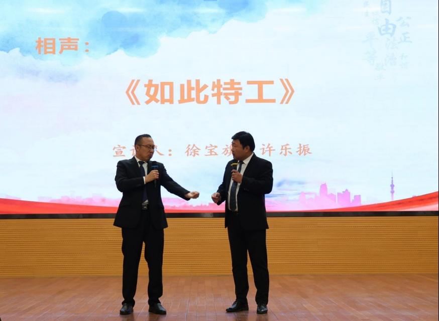 淄博市文昌湖区文化和旅游事业发展中心徐宝旗、博山区八陡镇许乐振带来相声《如此特工》,以诙谐的曲艺形式揭露违规评标、以权谋私等违纪违法行为,生动诠释了“法无授权不可为”的法治准则,引导党员干部知敬畏、守底线。