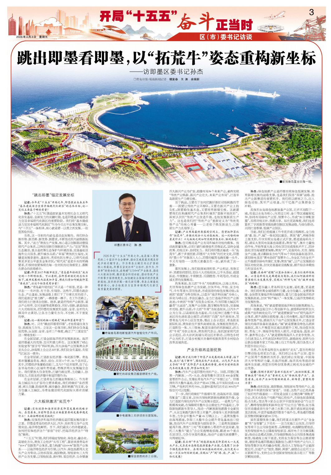 “十五五”时期,我们将锚定智能化、绿色化、融合化、高端化方向,聚焦工业经济“头号工程”,紧密承接青岛市“10+1”创新型产业体系,着力构建“1234+N”新型产业体系——以海洋特色经济为引领,以汽车、绿色能源两大龙头产业为带动,以纺织服装、商贸物流、智能家电三大传统产业为支撑,以智能制造、新材料、低空经济、生命健康四大新兴产业为扩容,前瞻布局N个未来产业,最终实现“传统产业焕新、新兴产业壮大、未来产业布局”,打造半岛新质生产力增长极。