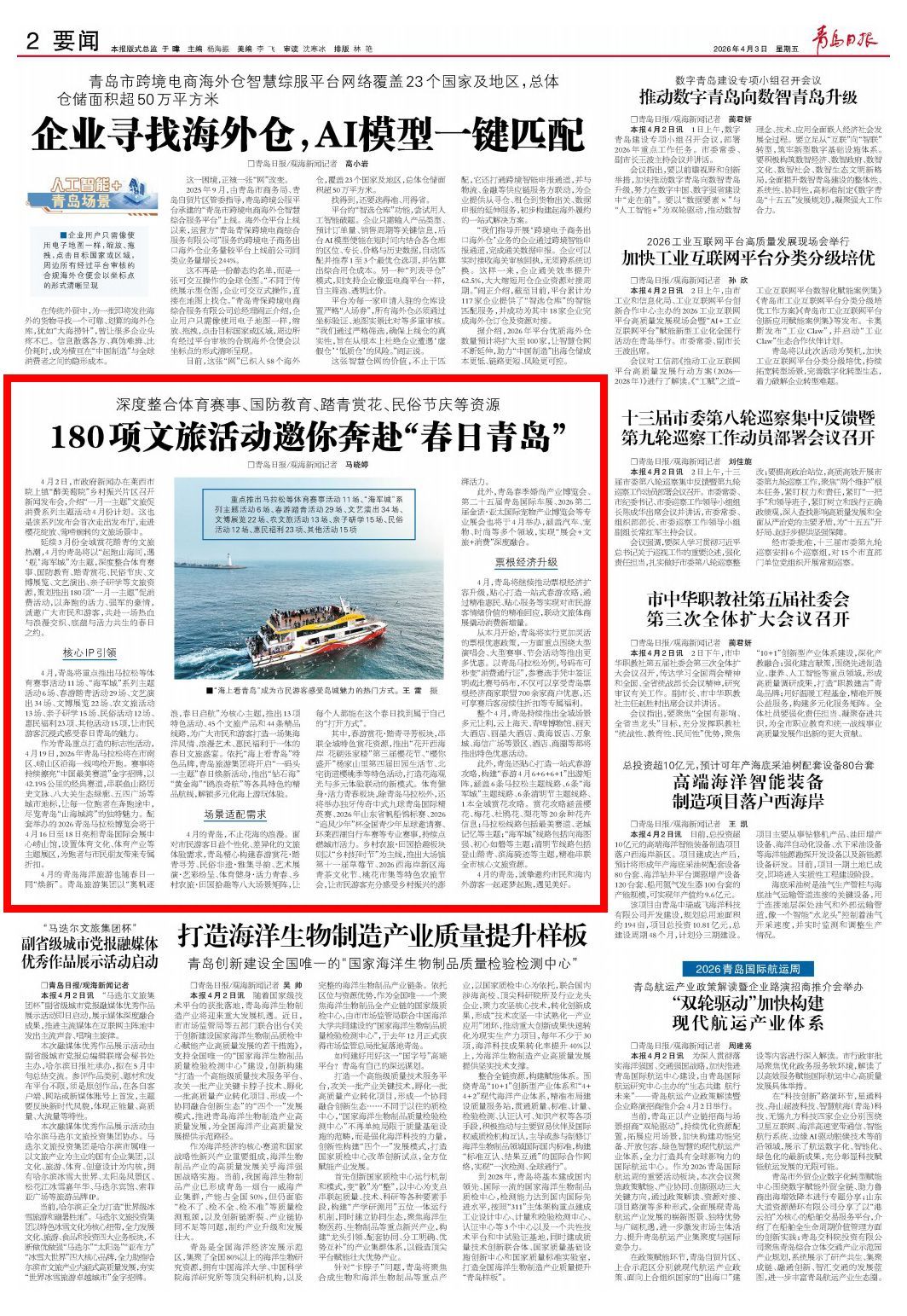 此外,青岛春季婚尚产业博览会、第二十五届青岛国际车展、2026第二届金诺·亚太国际宠物产业博览会等专业展会也将于4月举办,涵盖汽车、宠物、时尚等多个领域,实现“展会+文旅+消费”深度融合。