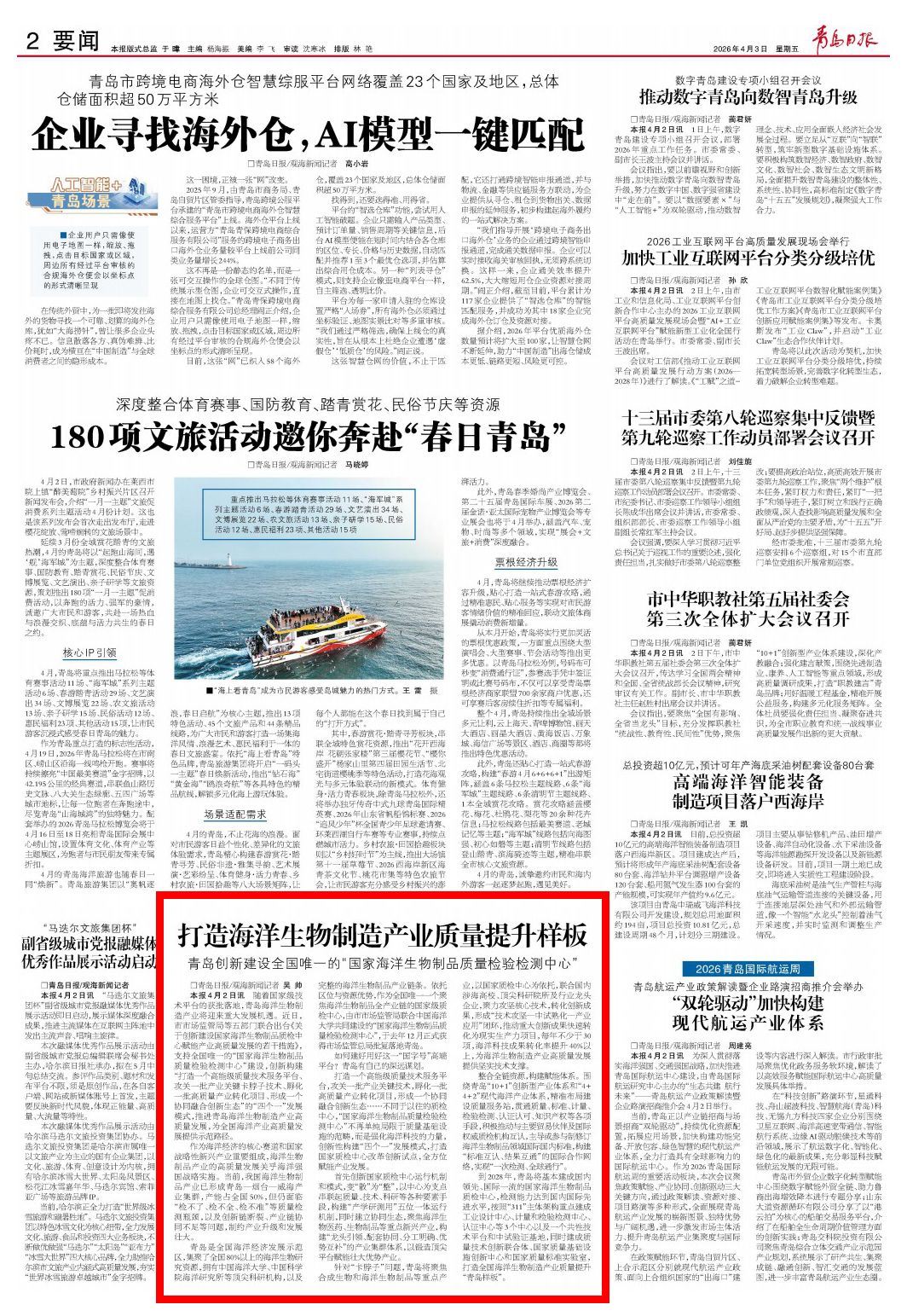 青岛日报社/观海新闻讯 随着国家级技术平台的获批落地,青岛海洋生物制造产业将迎来重大发展机遇。近日,市市场监管局等五部门联合出台《关于创新建设国家海洋生物制品质检中心赋能产业高质量发展的若干措施》,支持全国唯一的“国家海洋生物制品质量检验检测中心”建设,创新构建“打造一个高能级质量技术服务平台、攻关一批产业关键卡脖子技术、孵化一批高质量产业转化项目、形成一个协同融合创新生态”的“四个一”发展模式,推进青岛海洋生物制造产业高质量发展,为全国海洋产业高质量发展提供示范路径。