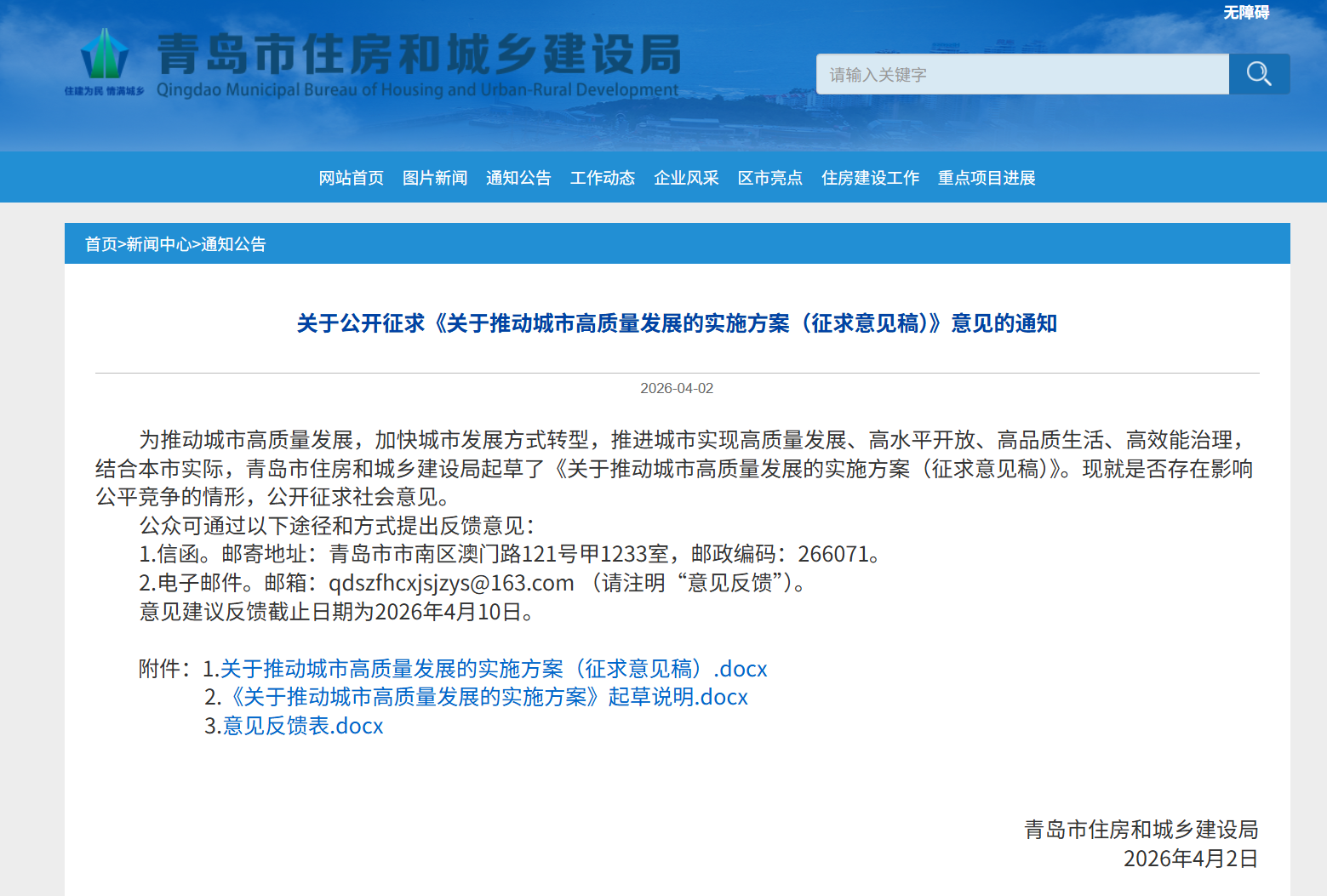 青岛日报社/观海新闻4月3日讯 城市是现代化建设的重要载体、人民幸福生活的重要空间。如何让城市更宜居、更有温度、更具活力?日前,青岛市住房和城乡建设局起草的《关于推动城市高质量发展的实施方案(征求意见稿)》(以下简称《征求意见稿》)正式向社会公开征求意见。