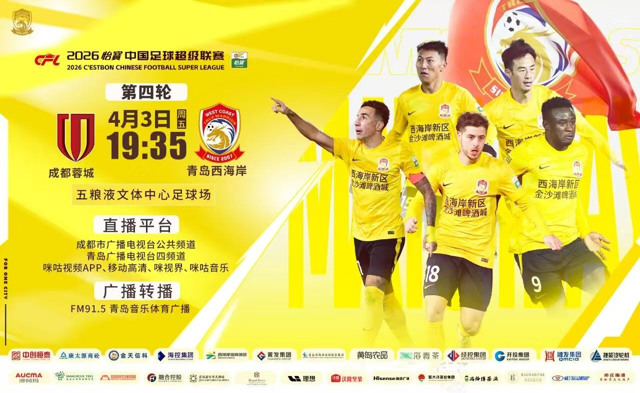 青岛西海岸队客场不敌成都蓉城队,观海新闻邀您为球队和球员打分→ ©原创 2026-04-03 21:35 青岛日报社/观海新闻 0 4月3日晚,在2026赛季中国足球超级联赛第4轮的一场焦点战中,青岛西海岸队客场1:5不敌“领头羊”成都蓉城队,目前战绩为1胜3负,观海新闻诚邀您为西海岸队和西海岸队球员打分。 点击图片或此处为球队及球员打分 责任编辑:孙飞