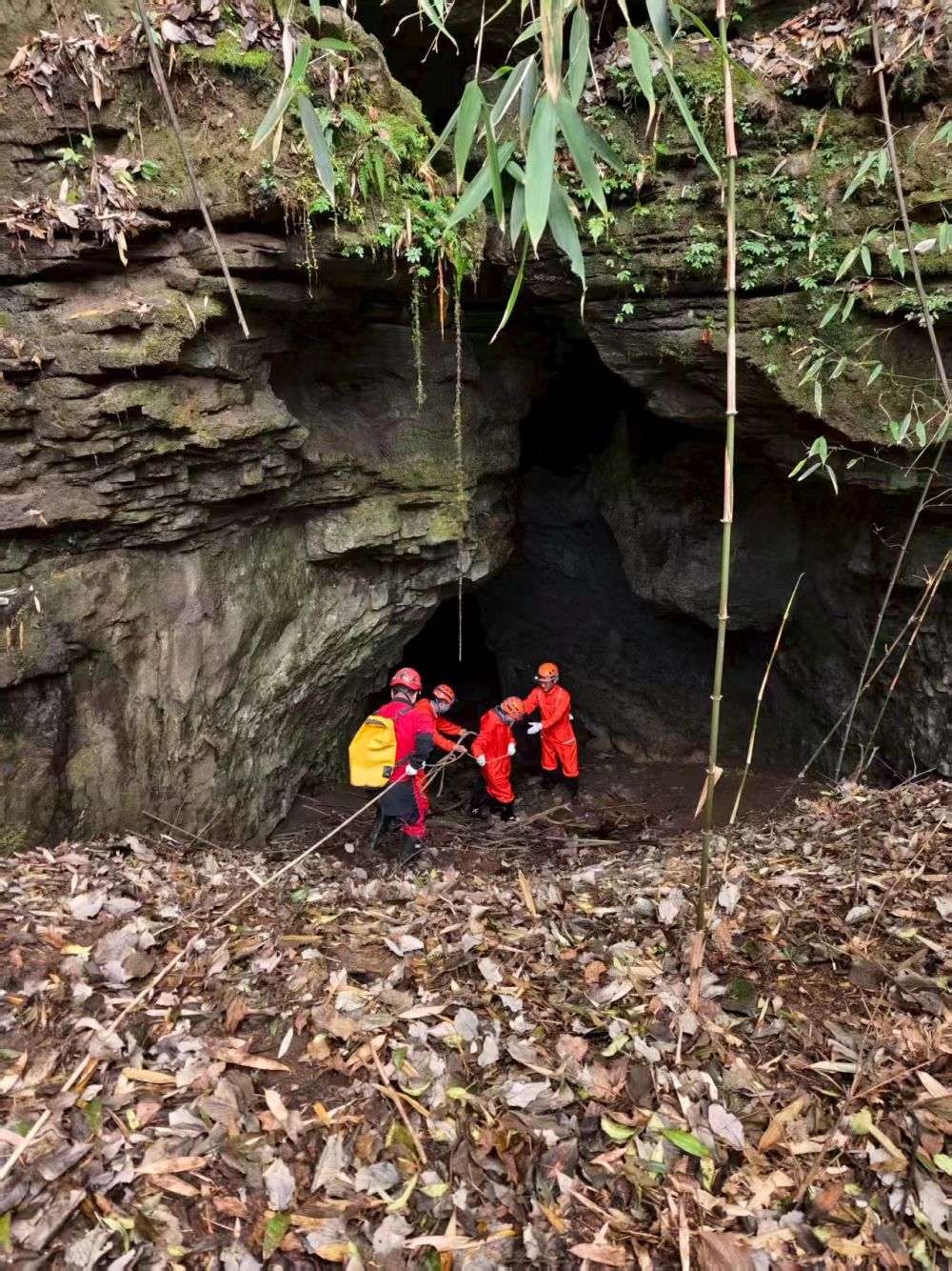 科考人员在贵州绥阳县双河洞发现羚牛化石的洞口,为入洞勘查做准备。(受访者供图)
