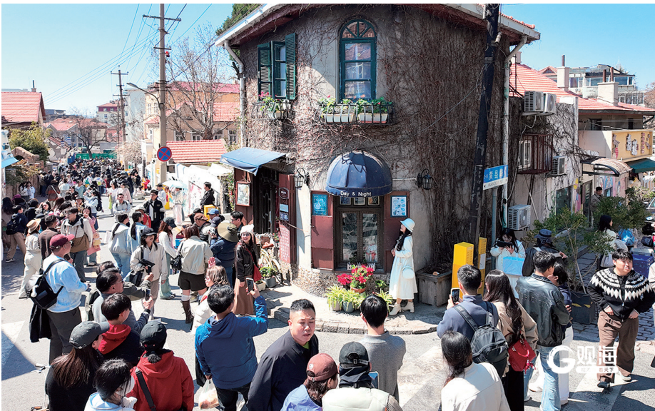 4月4日,清明小长假首日,龙江路、黄县路等网红打卡地热度爆棚,吸引众多年轻游客前来打卡。刘 栋 摄