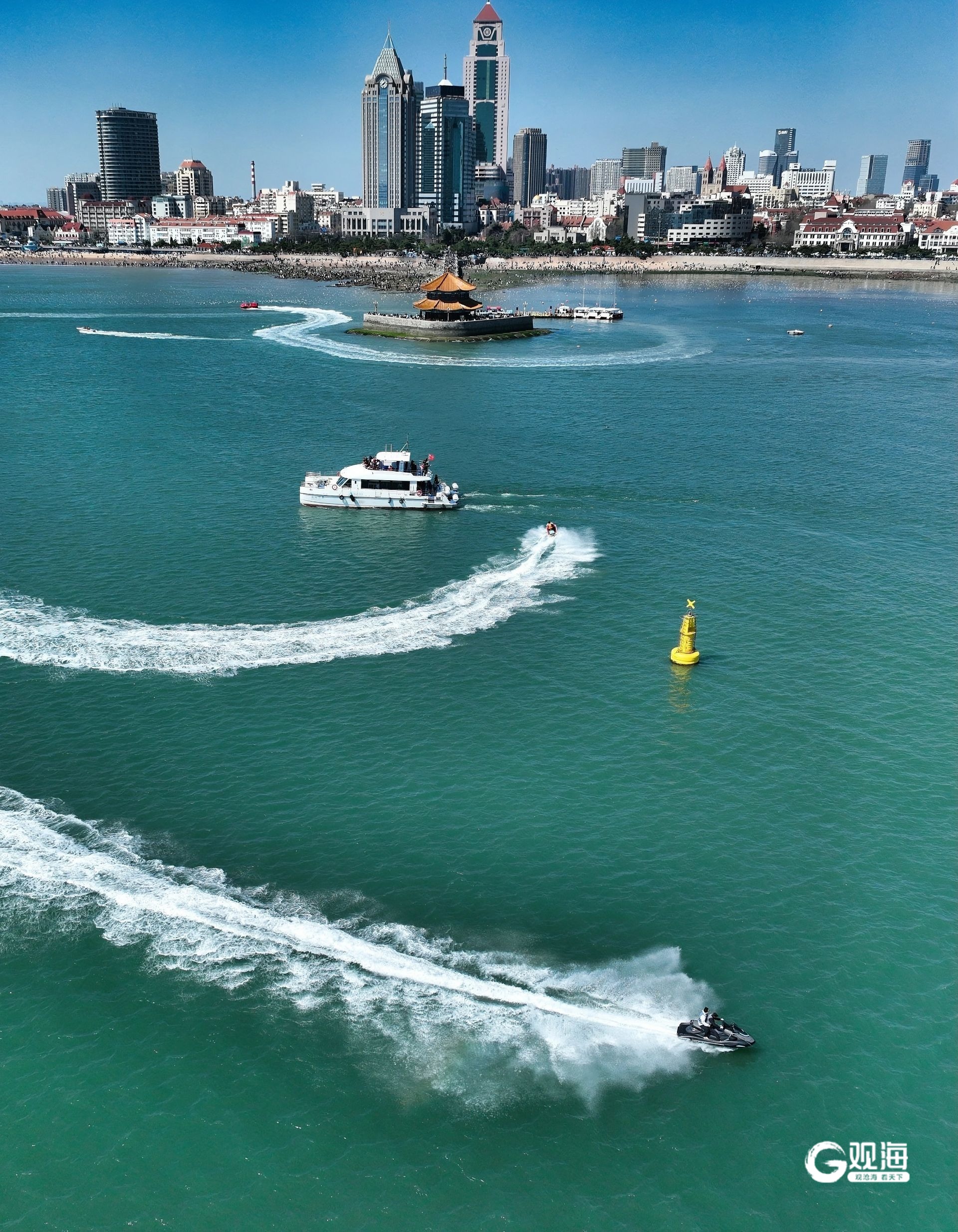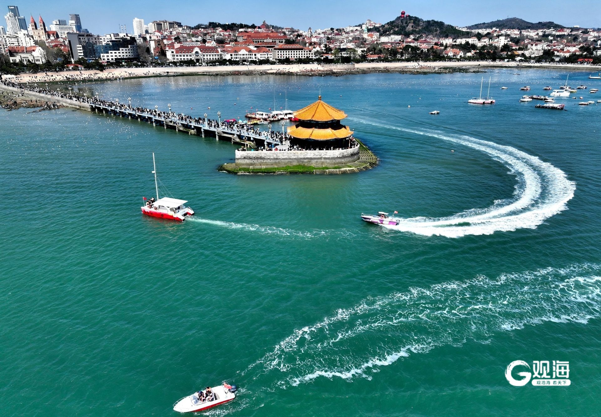上午时分,海面波平如镜。游船缓缓穿行于栈桥与小青岛之间的海域,船尾拖出的白色浪花,宛如画笔在蔚蓝画布上勾勒出的灵动线条。多条游船交错穿行,浪痕交织,在海面上绘出变幻莫测的几何图案。岸上盛开的樱花、新吐嫩绿的树木与海中的船影、浪痕相映成趣,构成一幅动静相宜的春日图景。