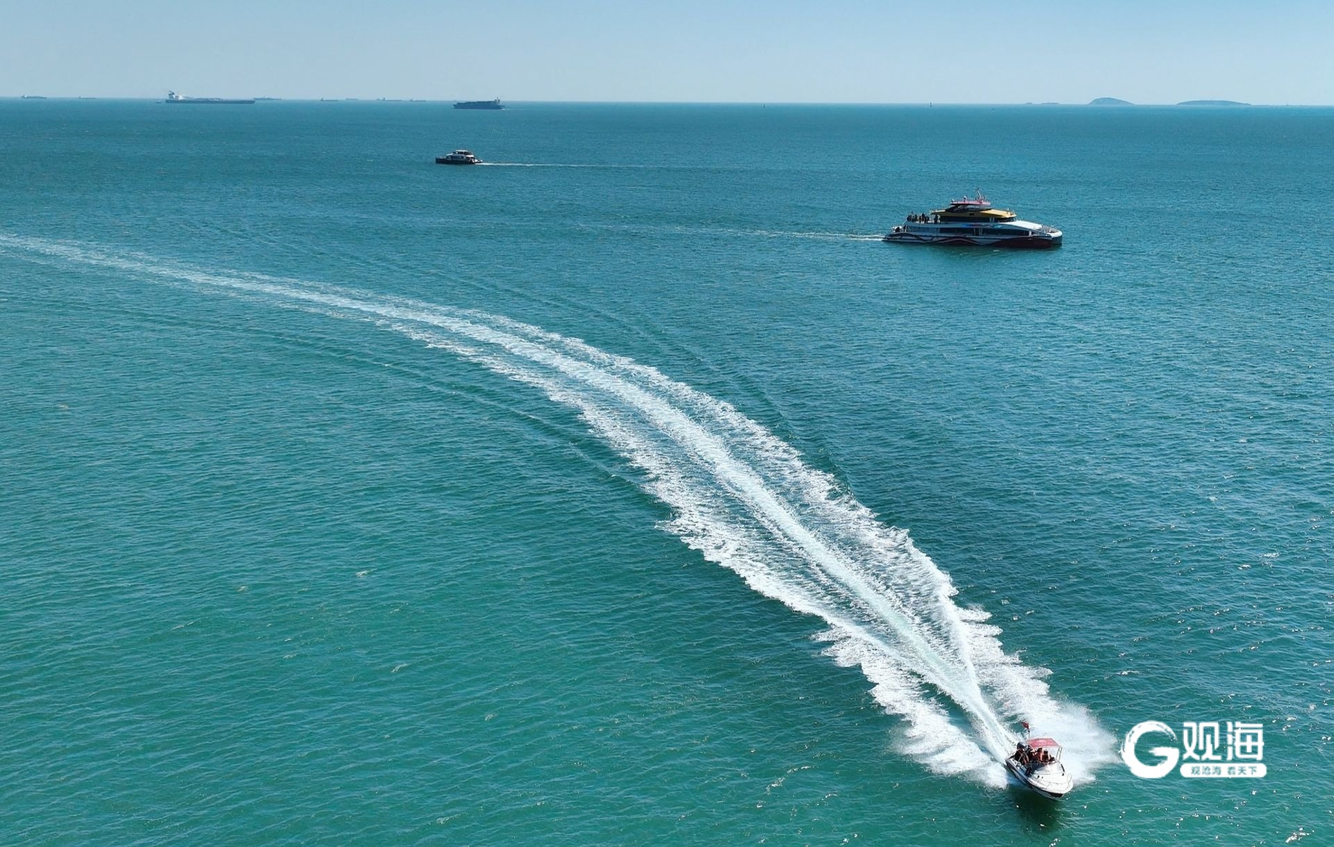 成群的海鸥追逐着船尾的浪花,时而盘旋,时而俯冲,为这幅“画作”添上了灵动的笔触。游客们倚栏远眺,栈桥回澜阁、小青岛灯塔与眼前的海上“画作”融为一体,美不胜收。