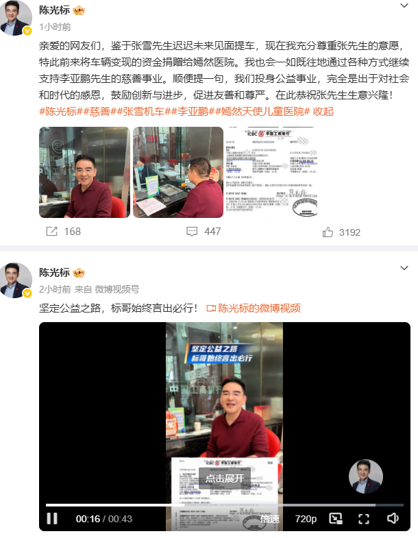 4月5日,陈光标发文:鉴于张雪先生迟迟未来见面提车,现在我充分尊重张先生的意愿,特此前来将车辆变现的资金捐赠给嫣然医院。我也会一如既往地通过各种方式继续支持李亚鹏先生的慈善事业。顺便提一句,我们投身公益事业,完全是出于对社会和时代的感恩,鼓励创新与进步,促进友善和尊严。在此恭祝张先生生意兴隆!