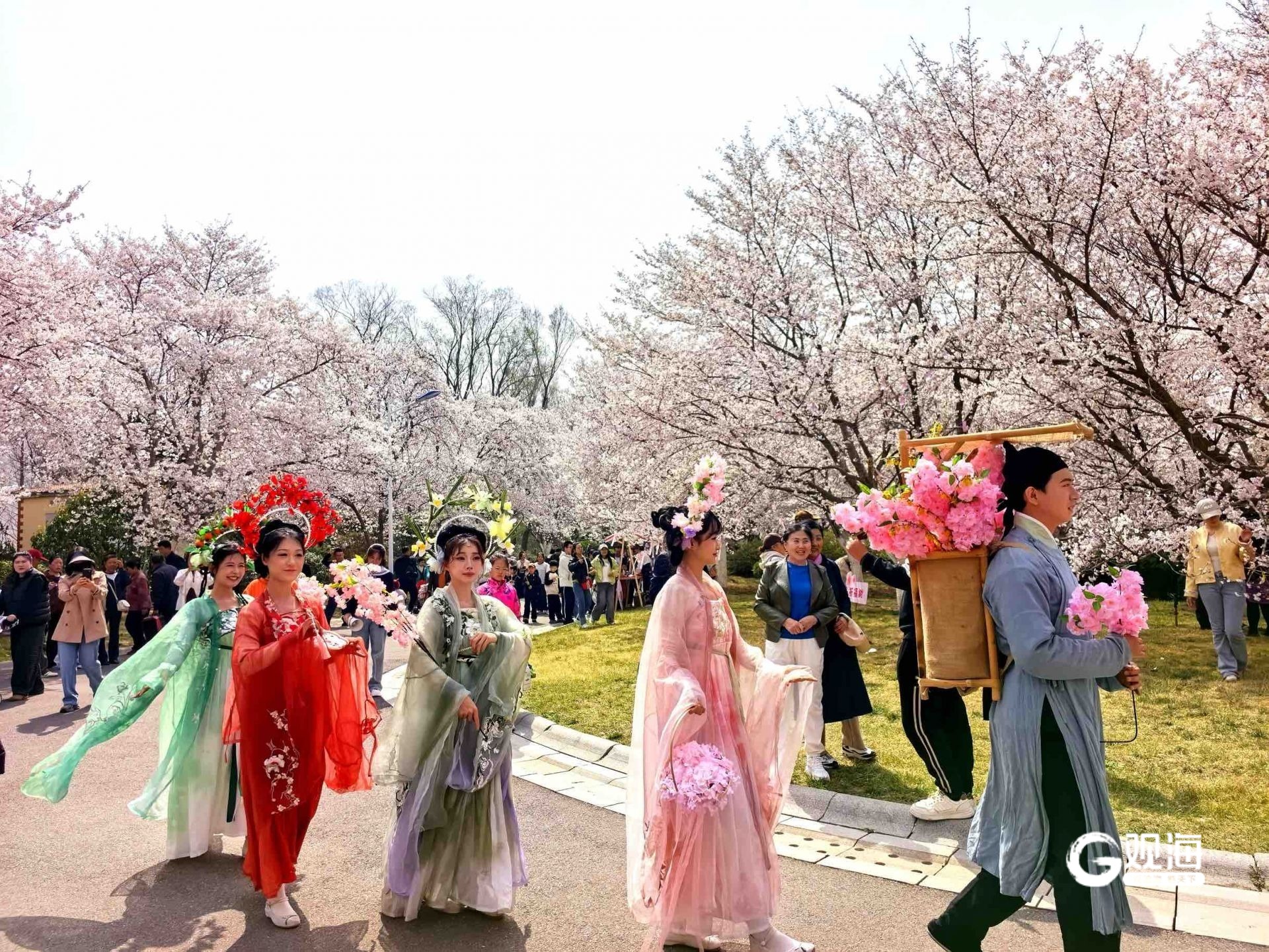 樱花节配套主题活动同样亮点纷呈、人气爆棚。“硬核坦克快闪与温柔樱花花海碰撞,反差感十足,太出片了!”在坦克快闪车展区,来自潍坊的游客李凯正在打卡拍照,解锁春日新潮体验。不远处,身着古风服饰的簪花郎巡游队伍缓步而行,头戴繁花、衣袂翩翩,与樱花景致相得益彰,成为林间一道流动的风景线;祈福树前,游客们提笔写下心愿牌,将春日期许与美好祝福系于枝头,寄托对生活的热爱。据青岛源诚画美达尼旅游发展有限公司总经理生杰介绍,假期期间园区日均接待游客近3万人次,赏樱观光与互动体验深度结合,让游客沉浸式感受春日乡村的独特魅力。